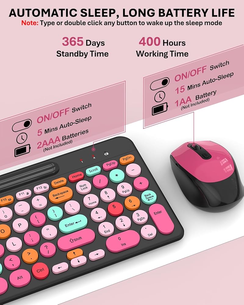 【Sleep Mode Extends Battery Life】Both the wireless keyboard and mouse feature independent power switches and an auto sleep mode that activates after 15 Mins of inactivity. Wake them up with a simple double-click on any key. The keyboard requires 2 AAA batteries while the mouse requires 1 AA battery (𝐧𝐨𝐭 𝐢𝐧𝐜𝐥𝐮𝐝𝐞𝐝)