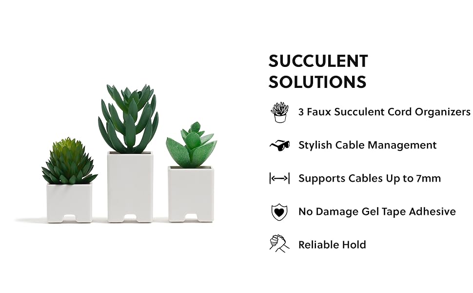 CHIC CORD MANAGEMENT: Keep your workspace tidy with this set of 3 adhesive cable holders, featuring lifelike faux succulent designs, perfect for managing cords and preventing tangles; designed to keep cords from slipping off your desk or countertop, this desk organizer ensures your workspace stays clean and functional