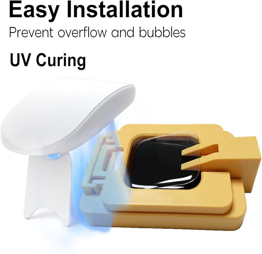 【New Version】- Our new type of adhesive is evenly dispersed on the watch screen and cured by light. The tempered glass screen protector will fit perfectly to the watch screen.