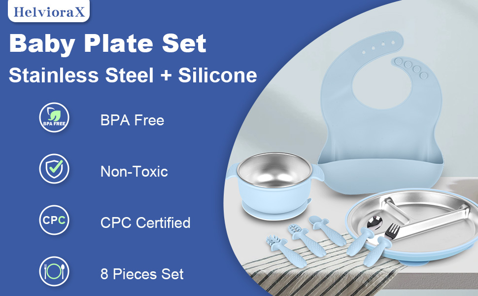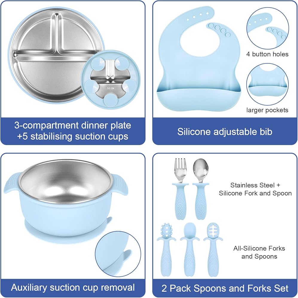 Baby Tableware Set: The baby plate set includes 1 stainless steel plate, 1 stainless steel bowl, 1 adjustable pocket bib, 1 stainless steel fork, 1 stainless steel spoon, and 3 different silicone spoons. It fulfills your baby's diverse feeding needs and makes a thoughtful choice as a baby shower gift