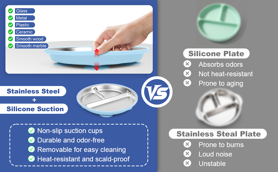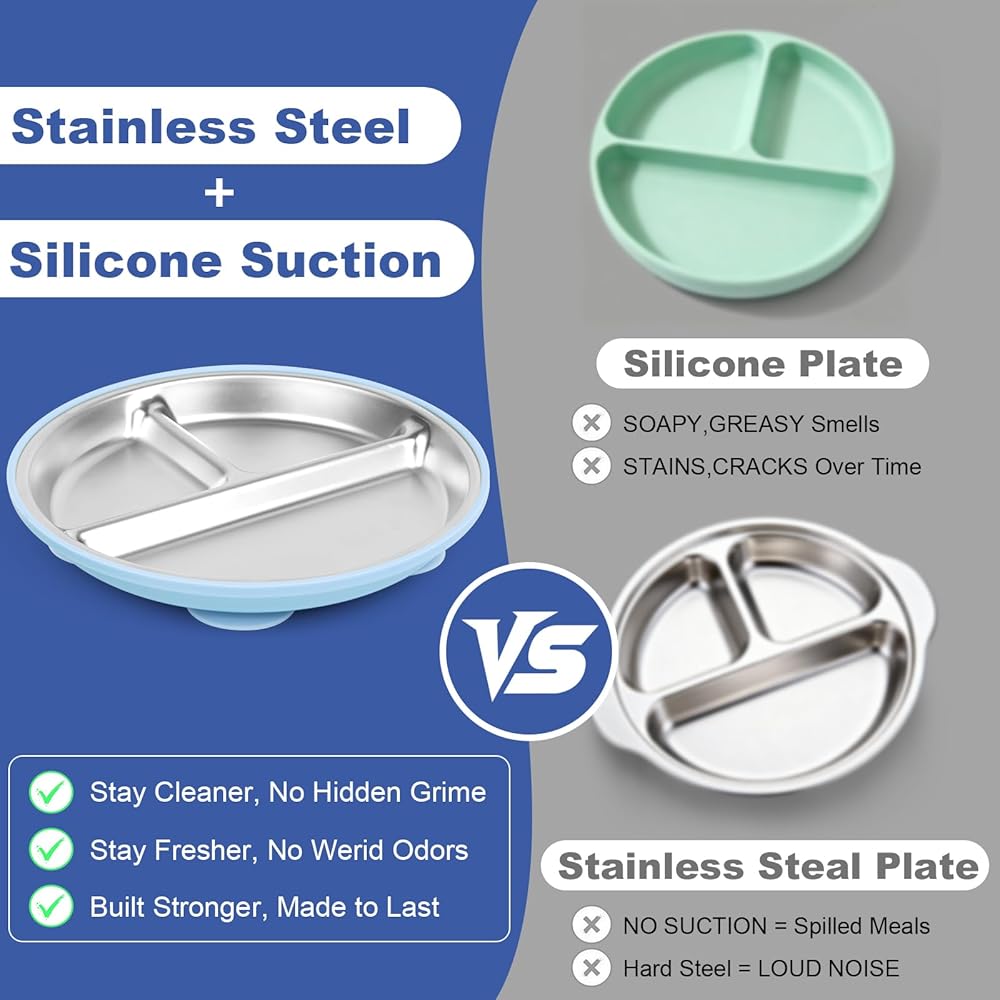 Material Safety: Made from food-grade 304 stainless steel with food-grade silicone, stainless steel kids plates are sturdy, shatter-resistant, and resistant to deformation. They are BPA-free and CPC-certified to safeguard your baby's safety at mealtime