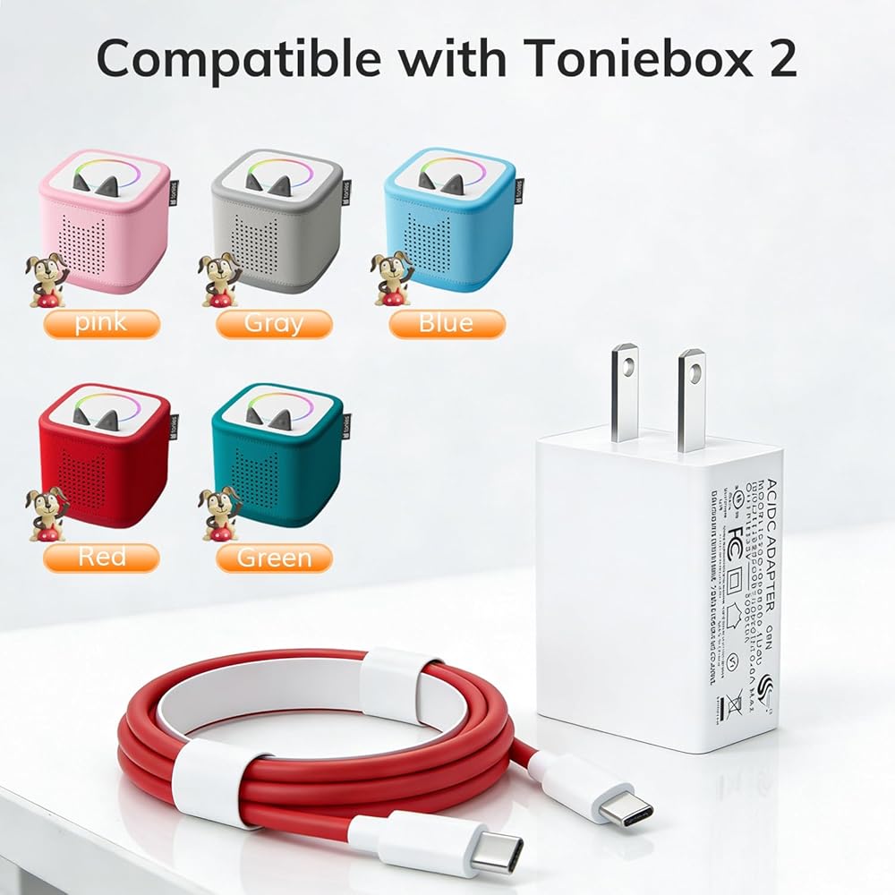 Designed for Toniebox 2, this charger features a snug interface for stable charging—ideal as a replacement or spare (not for Toniebox 1; Toniebox 2 not included!). Supporting 100-240V wide voltage and 15W fast charging, it fits home and travel use. The 1.5m TPE flame-retardant USB-C cable is wear-resistant, anti-bend, and eliminates socket distance limits. Built-in temperature control and full safety protections, tested strictly for peace of mind. The complete set is ready to use unboxed, with hassle-free after-sales and quick responses.