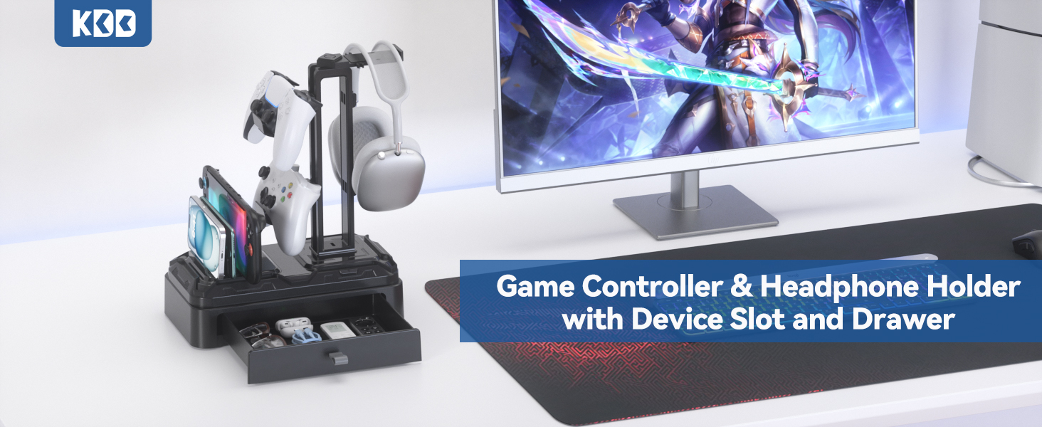 KDD Headphone Stand with Drawer - Rotatable Headset & Detachable Controller Holder for Desk - Multifunctional Organizer with Device Slot for Phones, Tablets - Universal for Gaming Accessories