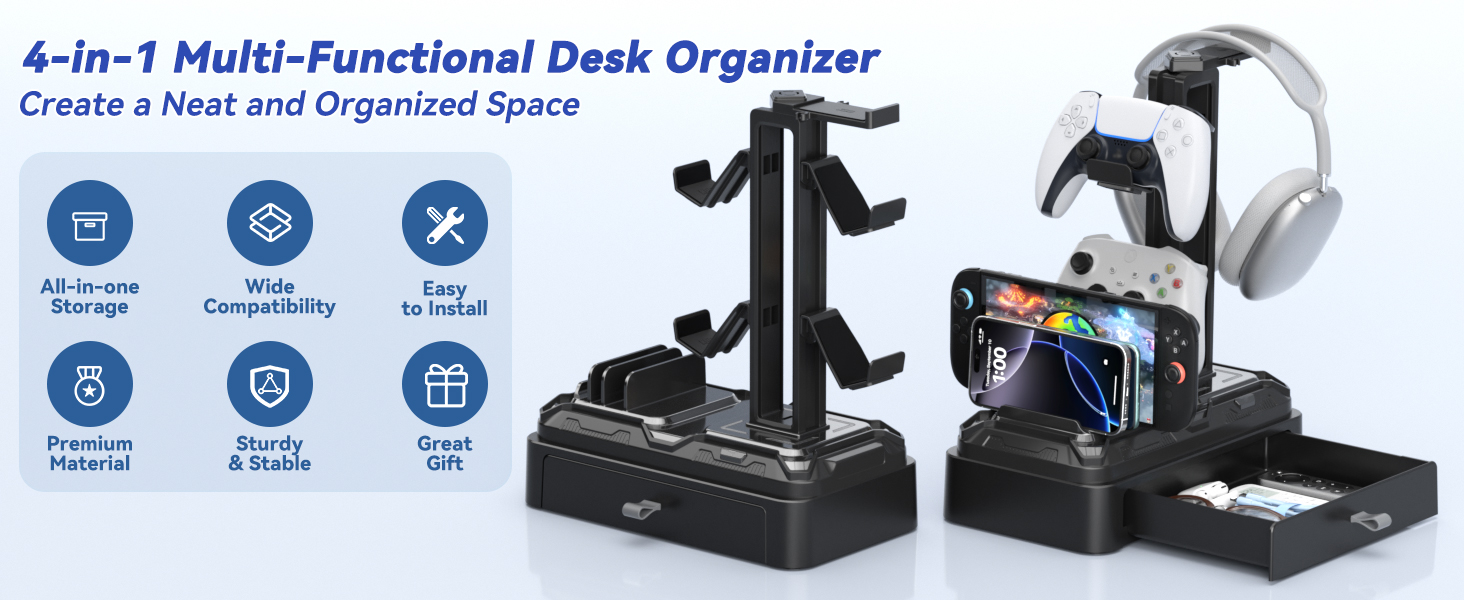 All-in-One Desk Organizer - Combining headphone holder, controller stand, device slot and drawer in one, effortlessly covering your diverse storage needs for gaming and daily items. The four functions work together to eliminate desktop clutter, keeping your desk surface neat and efficient, truly multi-purpose.