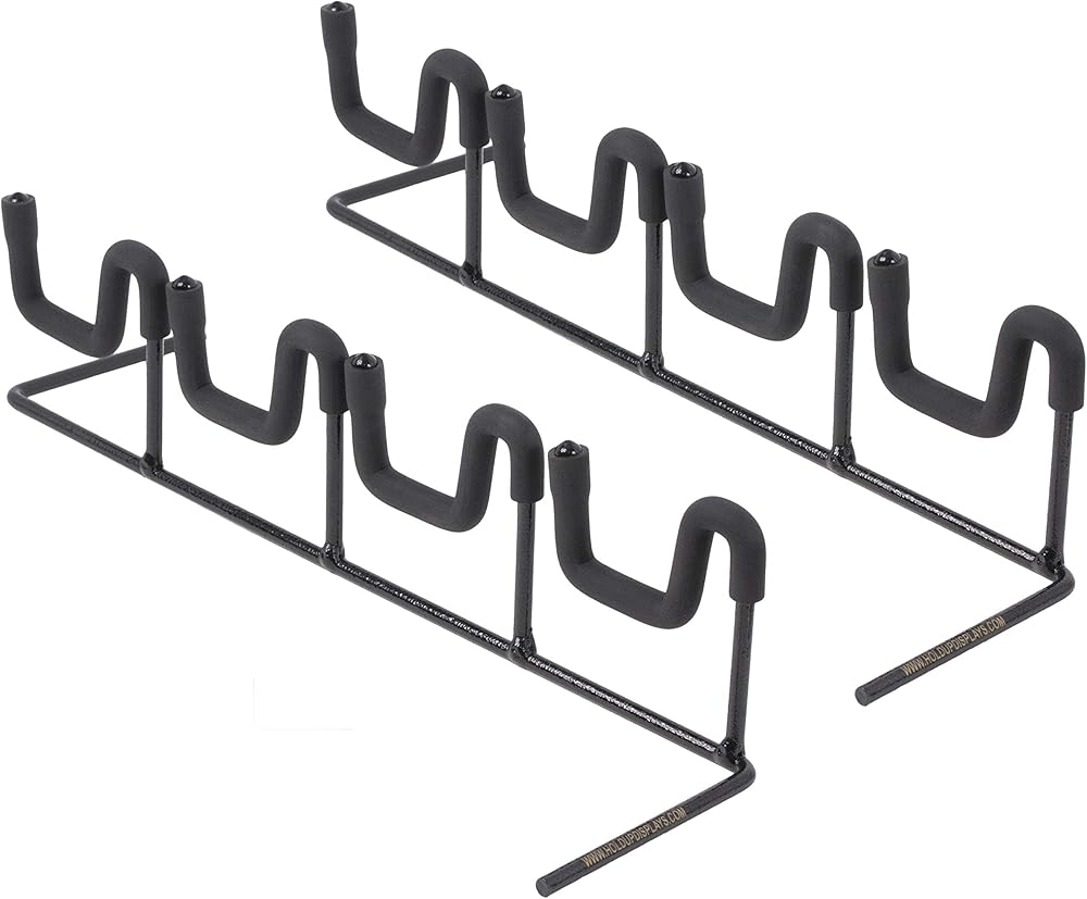 Simple & effective display to hold 4 revolver or semi-automatic pistols. Perfect for display cases or gun safes. Durable black powder coat finish & protective padding that allows for safe rest of pistols. Low profile design makes for a great space saver.