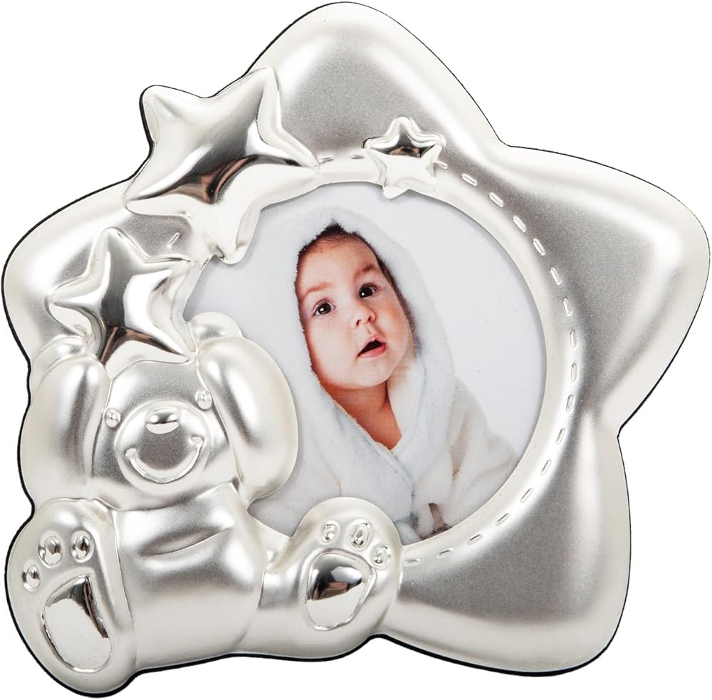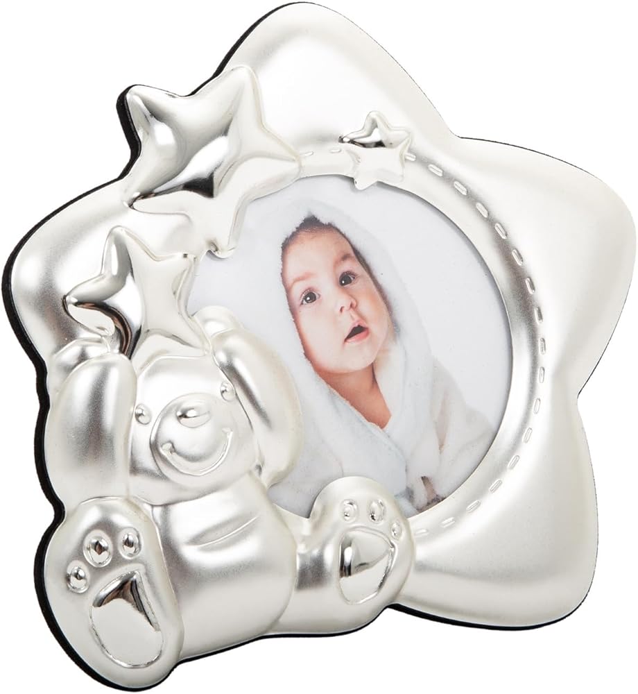 Beautiful star shaped small baby picture frame in two tone satin silver and silver plated highlights. Features smiling teddy bear and three decorative inner stars.