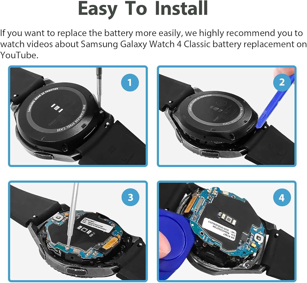DRECHAS Battery for Samsung Galaxy Watch 4 Classic SM-R890 comes with professional complete repair tool kits. If you want to replace the battery more easily, we highly recommend you to watch videos about EB-BR890ABY battery replacement on YouTube. Novices can easily install, no need to worry about the installation is too complicated.