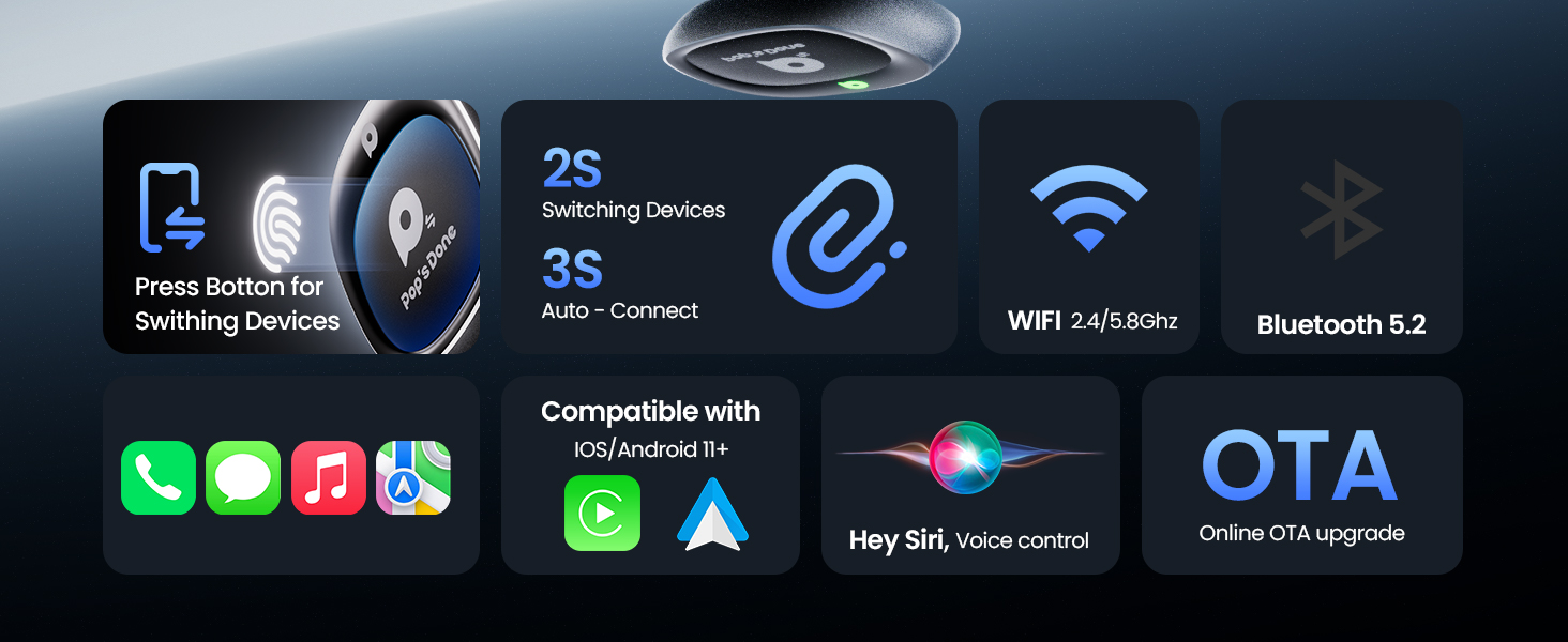 One Click Multi Device Switching Effortlessly toggle smartphones with single button control using this 2 in one Miniwireless carplay adapter. Perfect for families, rideshare drivers, or professionals switching between Apple CarPlay & Android Auto instantly.