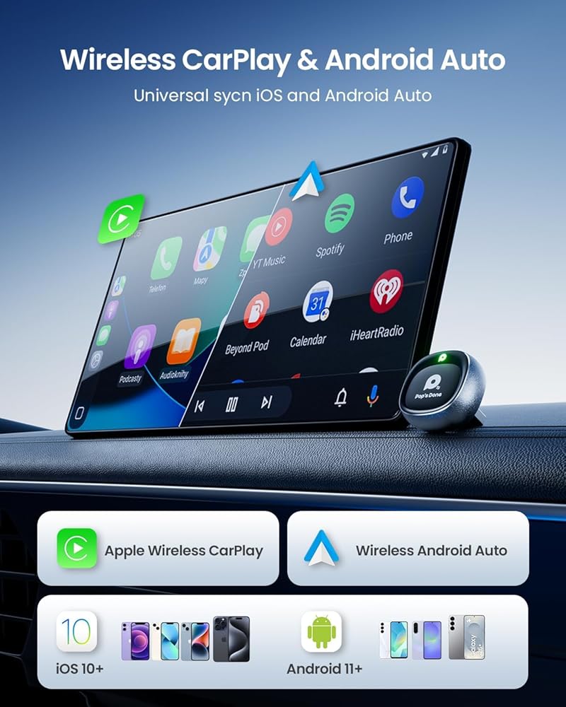 2026 Newly Upgraded Apple Car Play Wireless Adapter: Compatible with Vehicles Manufactured 2018 or Later. Engineered for multi-user scenarios including family shared cars, rideshare services, and corporate fleets. Maintains consistent connectivity when switching personal/work phones or connecting passenger devices, also compatible with Android Auto systems.