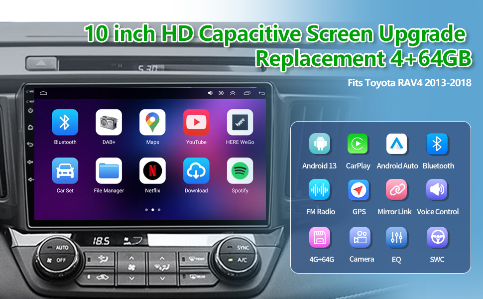 [4+64G] Android 13 Car Stereo with Wireless Apple Carplay & Android Auto for Toyota RAV4 2013-2018 10" Touchscreen Radio Upgrade with AHD Camera,GPS Navigation,SWC,WiFi,FM,Bluetooth