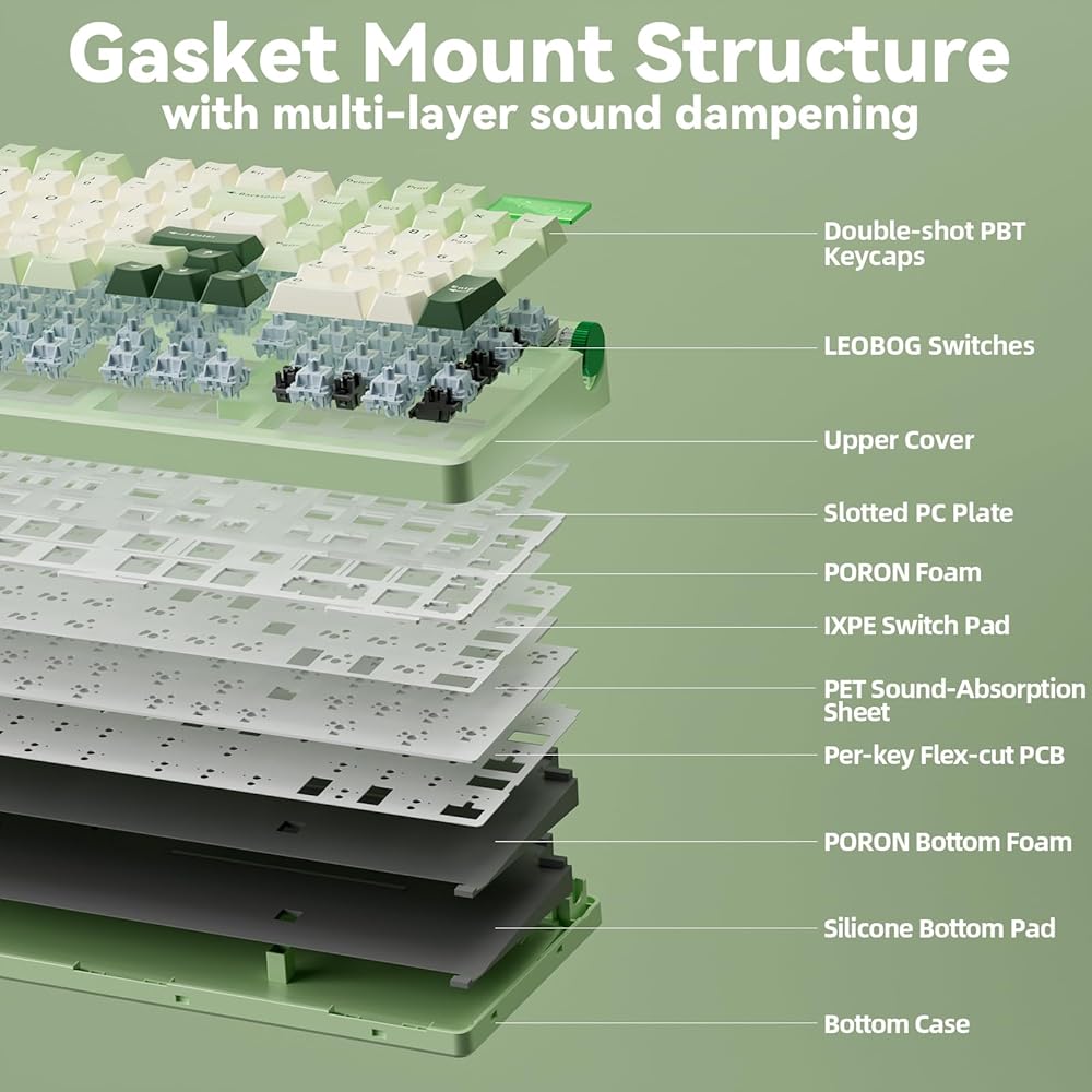 Gasket Mounted Creamy Sounding: The LEOBOG A98 gaming keyboard features a gasket-mounted structure with five layers of internal sound damping—engineered for a smooth, quiet, and highly satisfying typing experience. This advanced design eliminates hollow ringing and reduces vibration, delivering a refined acoustic profile that's perfect for both focused work and intense gaming. As a wireless mechanical keyboard built for shared environments