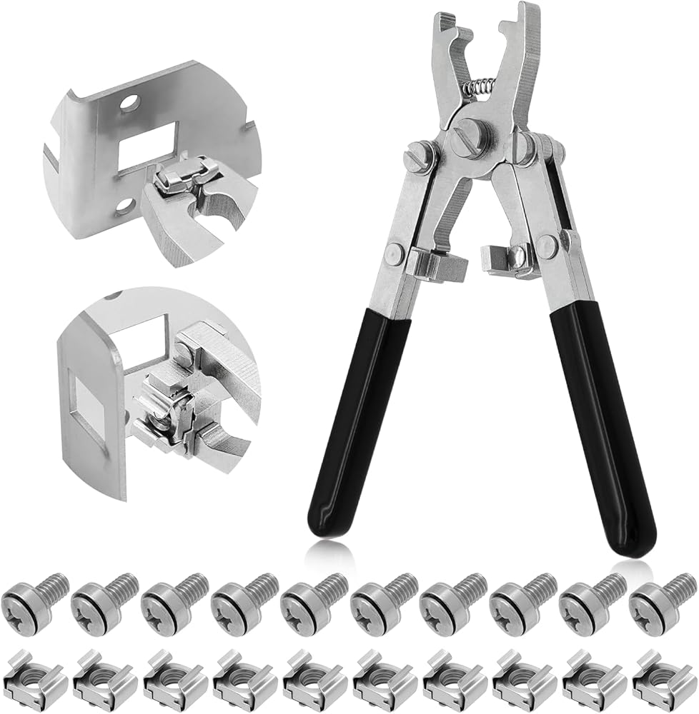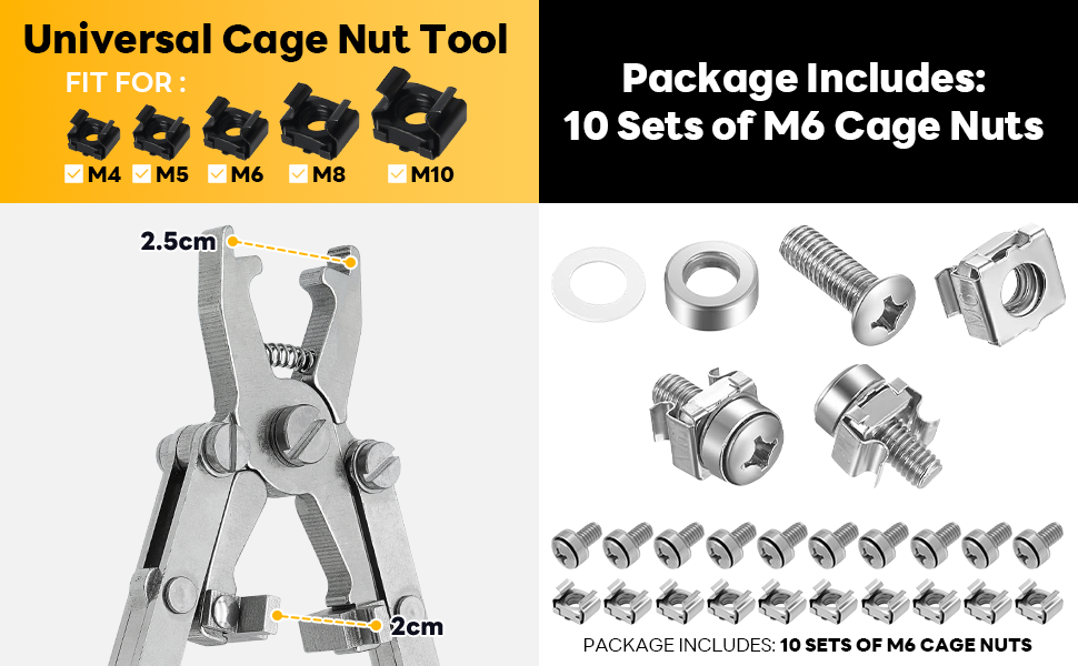 【 Complete Ready-to-Use Kit 】A tool kit for you to get everything to start your project. This value bundle includes 1 premium cage nut tool and 10 sets of high-quality M6 silver cage nuts, screws, and washers. The rack studs and cage nuts is clean and accurate without burr. No need to buy rack mount screws separately—this is your all-in-one rack nuts and screws solution.