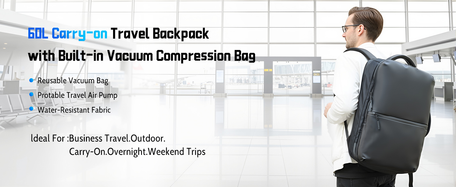Electric Vacuum Compression System (With Pump) – Designed To Maximize Packing Space: Designed as a complete electric vacuum compression system for a vacuum travel backpack, rather than a single feature, using an electric pump and vacuum bag to support consistent compression performance across repeated packing cycles. Vacuum compression can help reduce clothing volume by up to 50% or more, especially for bulky items such as down jackets.