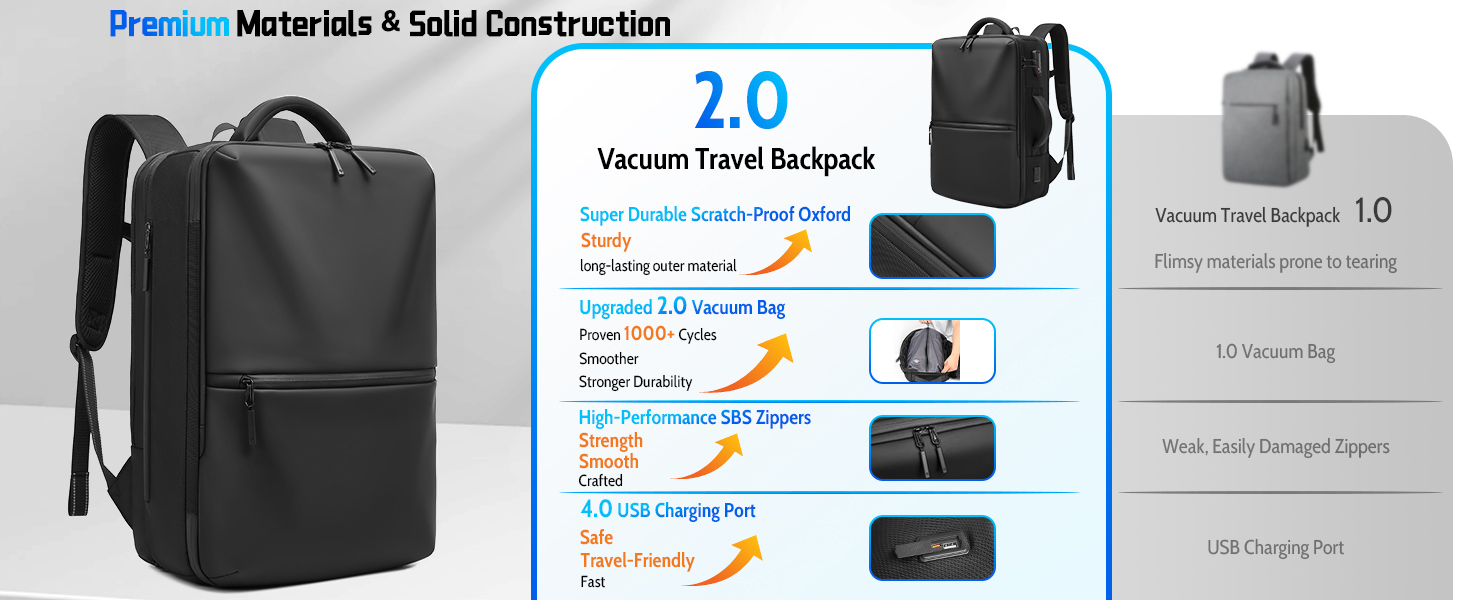 Premium Materials & Comfort – Water-Resistant 900d Fabric: Built with water-resistant 900D Oxford fabric, high-quality SBS zippers, and reinforced stitching to support repeated packing and vacuum compression use, ensuring durability expected from a premium vacuum compression backpack, along with ergonomic padded adjustable straps and 3D breathable multi-panel back padding for all-day travel comfort.