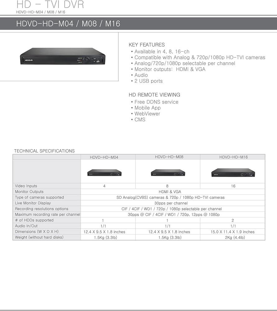 Compatible with Analog & 720p/1080p HD-TVI cameras Analog/720p/1080p selectable per channel Monitor outputs: HDMI & VGA Audio 2 USB ports Free DDNS service Mobile App WebViewer CMS