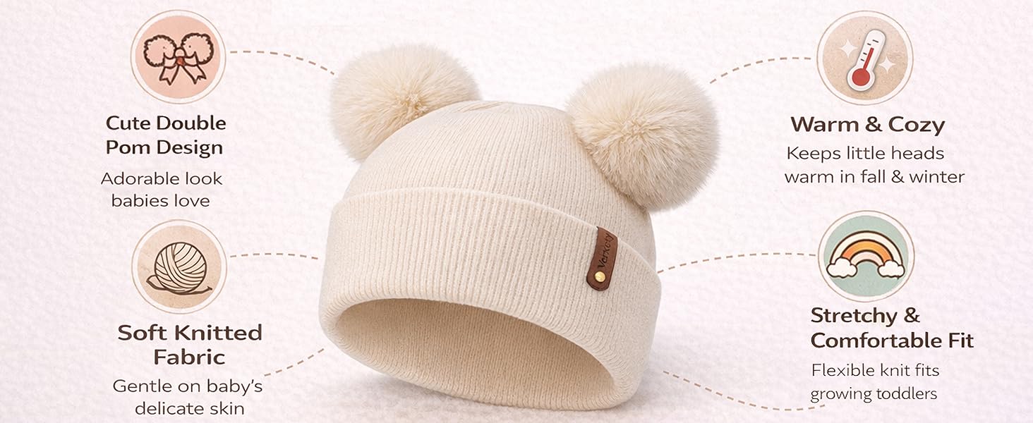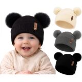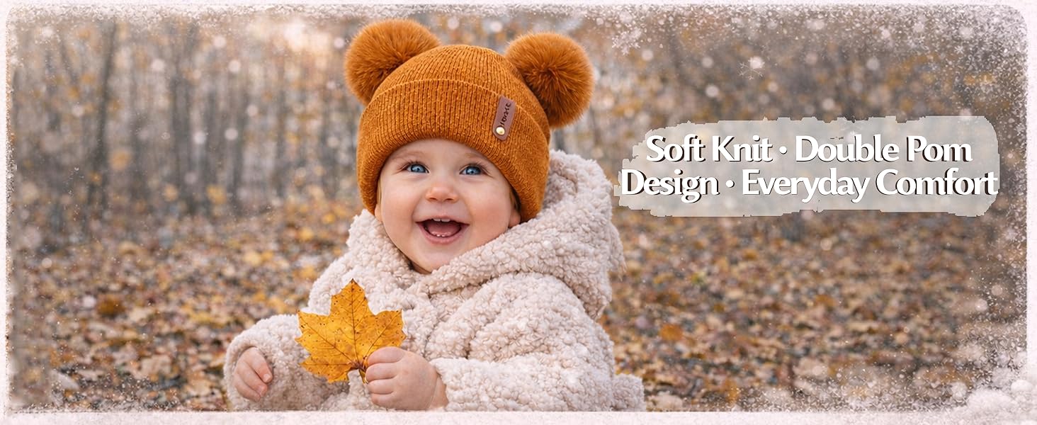 🎀Cute Double Pom-Pom Bear Design:Charming double pom-poms create a cute bear-ear look babies love. Stylish and playful, great for everyday wear and photo moments.
