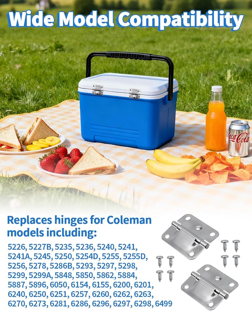 Precise Fit & Compatibility: Measuring 2" x 1.85", this cooler hinges replacement is engineered to fit the pre-drilled holes on many for Coleman cooler models (including, 5226, 5227B,5235,5236, 5240, 5241, 5241A, 5245, 5250, 5254D, 5255, 5255D, 5256, 5278, 5286B, 5293, 5297, 5298, 5299, 5299A, 5848, 5850, 5862, 5884, 5887, 5896, 6050, 6200, 6201, 6240, 6250, 6251, 6257, 6260, 6262, 6263, 6270, 6273, 6281, 6286, 6296). It also matches part numbers 3000005301 and 6155-5741 for a direct swap