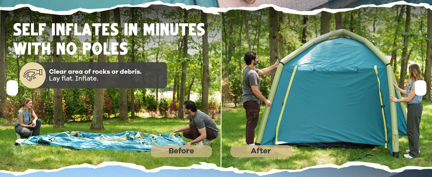 Upgrade your outdoor adventures with the Oaktiv CloudCamp Inflatable Camping Tent–the perfect blend of comfort, speed, and durability. Designed for modern campers, glampers, and outdoor explorers, this blow up tent eliminates the hassle of traditional pole setups thanks to its TPU air column frame that inflates in minutes. Constructed from high-quality 210D Oxford fabric, with a waterproof base and UV50+ protection, this air tent stands up to rain, wind, and sun, making it a reliable shelter for every season. The spacious 10 ft x 10 ft x 6.5 ft design comfortably fits up to 6 adults. This much room makes it ideal for couples, families, or a group of friends. Whether you're hiking deep into the woods, glamping by the lake, or hosting a backyard adventure, the Oaktiv CloudCamp inflatable tent is your go-to portable shelter. Lightweight, stylish, and easy to pack with the included carrying bag, it's perfect for campers seeking a high-end, fast-setup option. Enjoy features like interior storage pockets, mesh ventilation, secure zipper closures, and a dome-style frame for improved wind resistance. Available in multiple color options, this inflable tent is functional and designed to elevate your outdoor lifestyle. Choose the Oaktiv CloudCamp inflatable tents for camping — Nature's Favorite Brand!