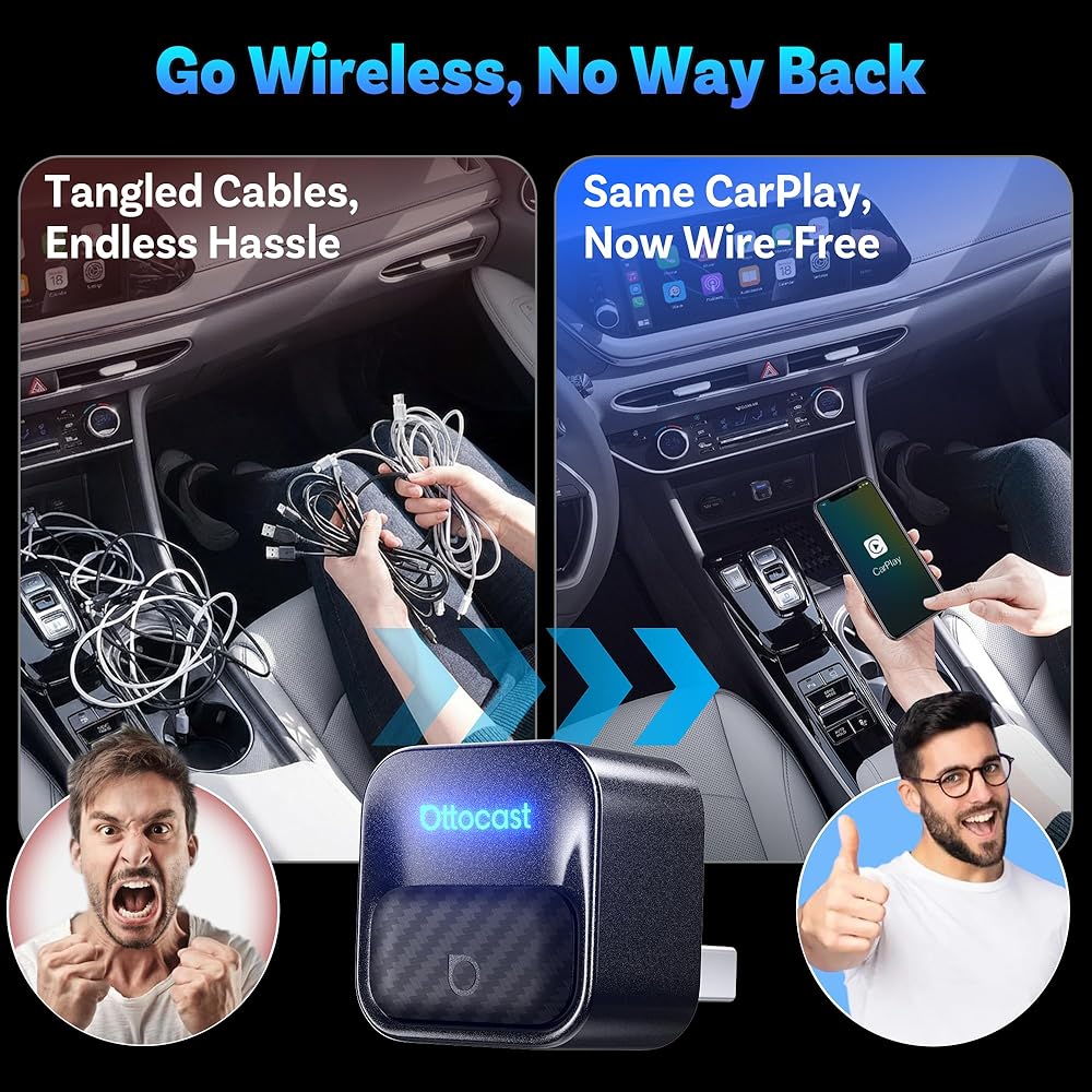【Hop in, start up, stay connected】Set it up once and the Ottocast Mini 4.0 handles the rest. Start your car and it connects instantly — wire-free, of course. Your touchscreen, steering wheel controls, knobs, Siri, and Google Assistant all work like normal. Smart temperature control keeps your Wireless CarPlay Adapter cool, even on long road trips.