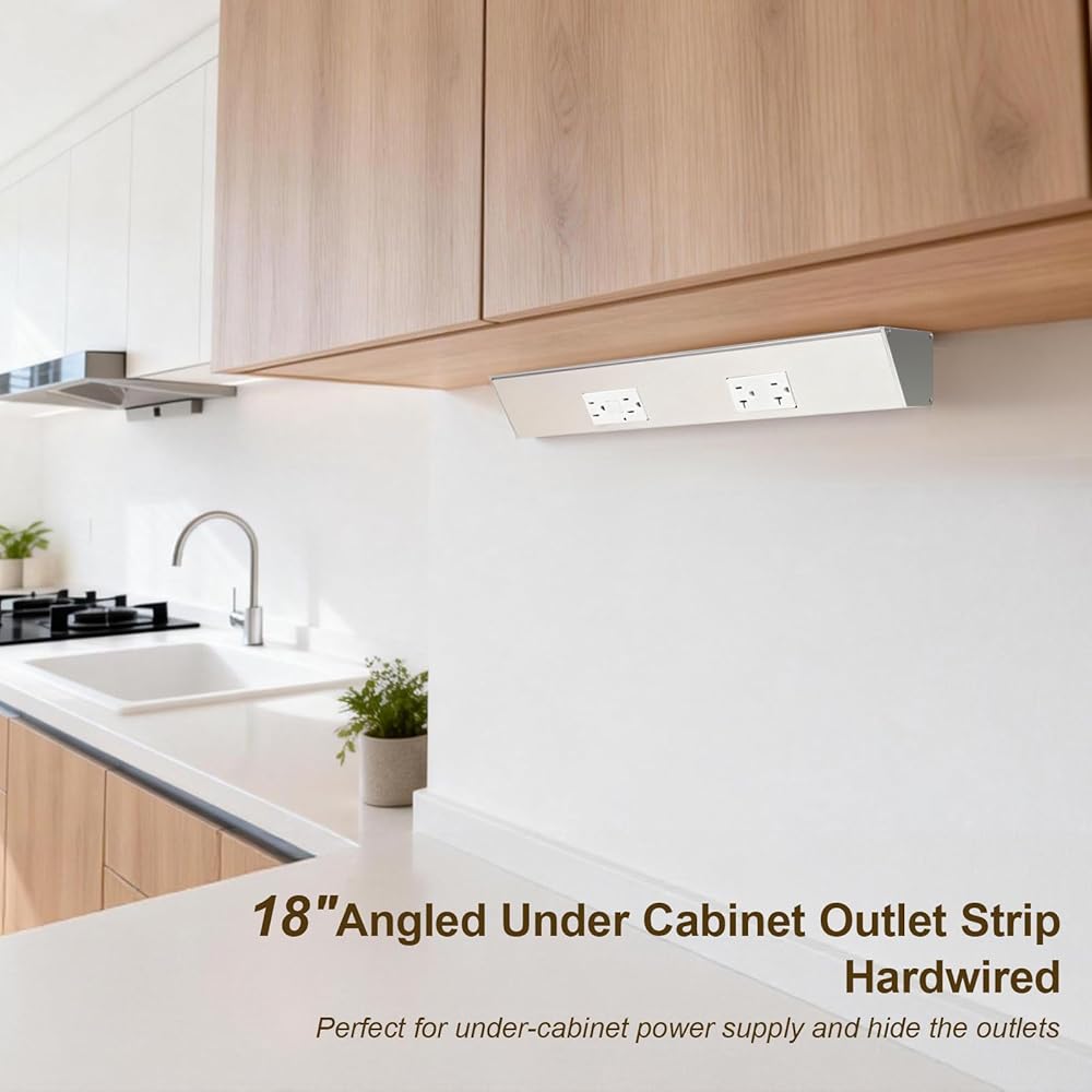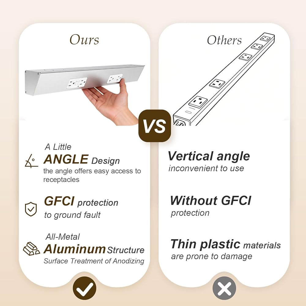 Under-Cabinet Hidden Electrical Solution: This angled under cabinet outlet strip features a low-profile design for easy concealment. Its angled design, unlike vertical models, allows for easy access to outlets. Ideal for under kitchen cabinets/countertops, vertical installation beside bathroom mirrors, workbenches, etc. The cleverly hidden outlets keep your kitchen backsplash unobstructed