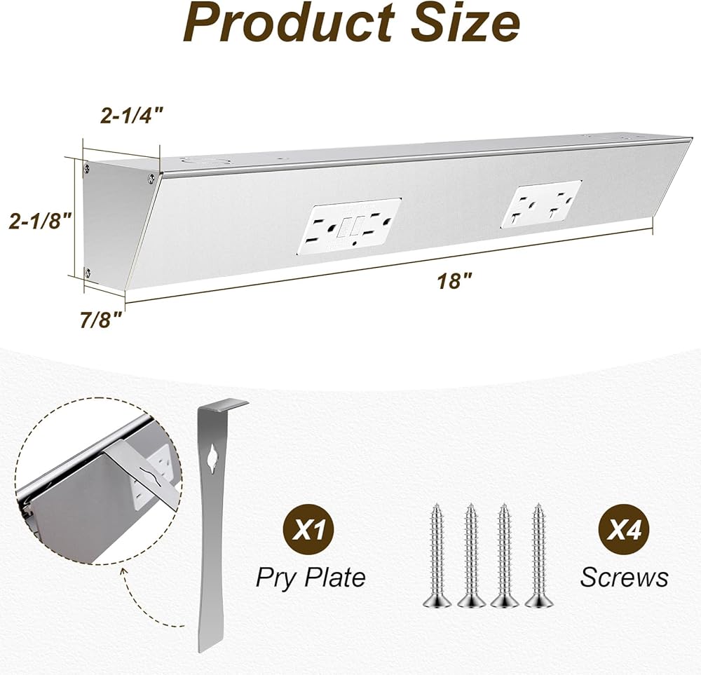 Pre-Wired for Easy Installation: This under cabinet outlet strip hardwired enables hassle-free wiring—only one quick main circuit connection is needed for full setup. It features knockout holes and all necessary mounting hardware; the included pry plate allows easy, quick lid removal. Especially ideal for most bottom-recessed wall-mounted cabinets, it seamlessly conceals outlets under cabinets for a clean, uncluttered look