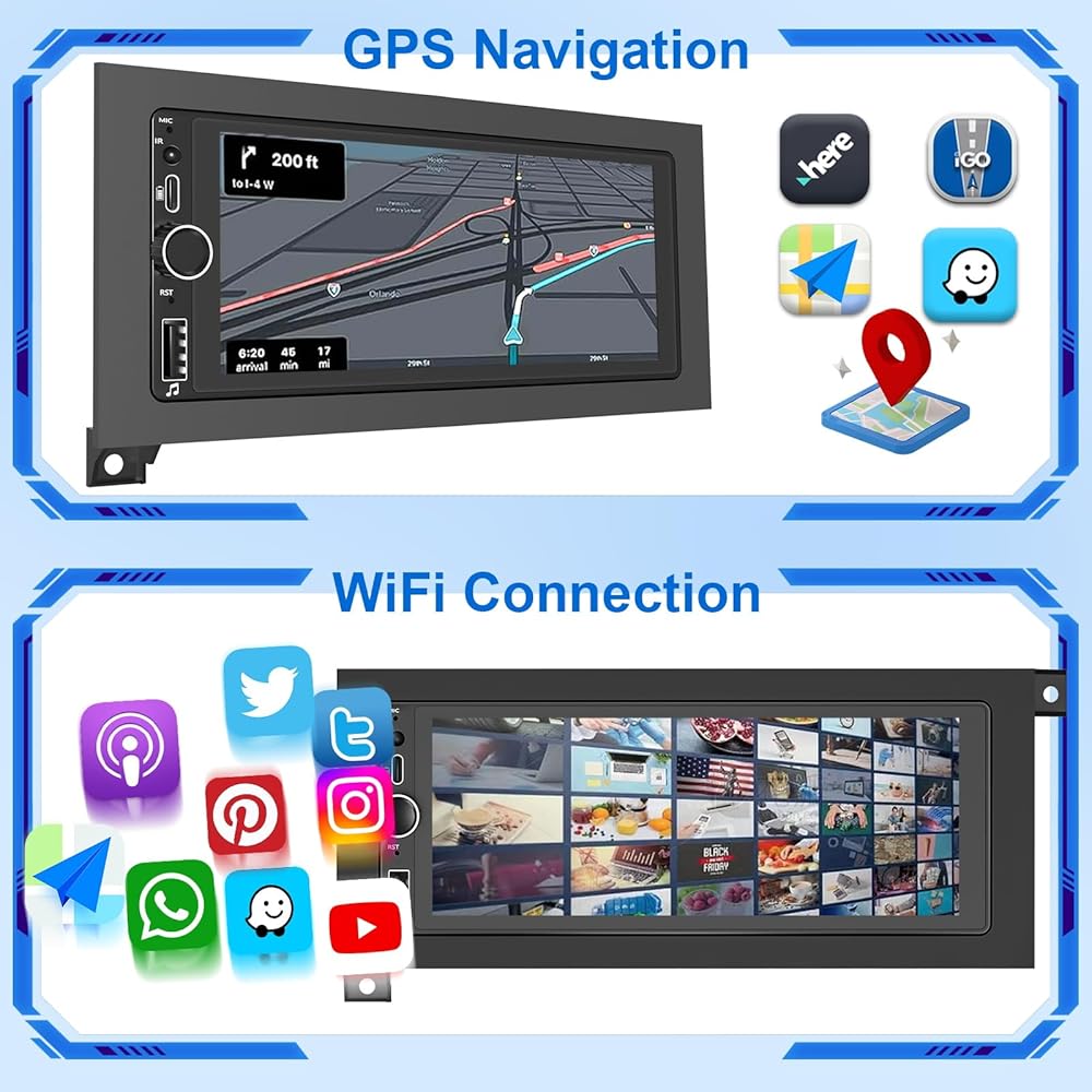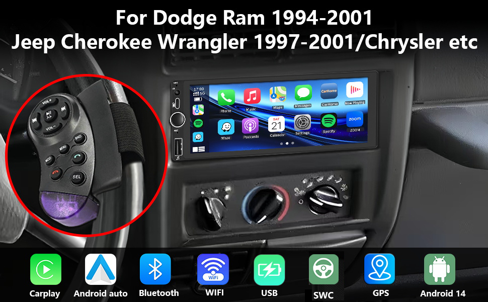 Car Stereo Radio with GPS Navi WiFi Carplay Android Auto SWC Remote for 1994-2001 Dodge Ram Dakota/Jeep Wrangler Cherokee 1997-2001/ Chrysler Town and Country 1990-2000/Sebring Cirrus