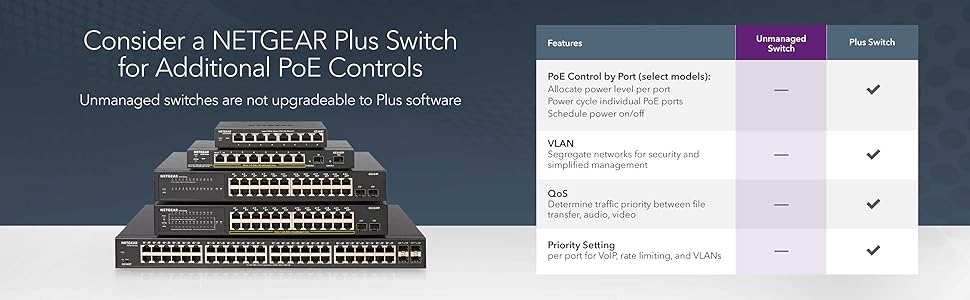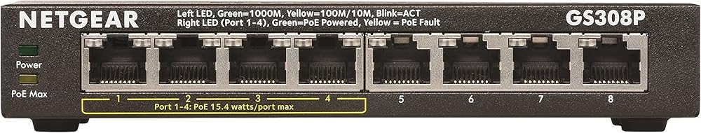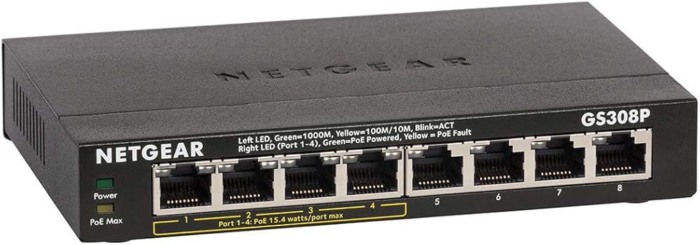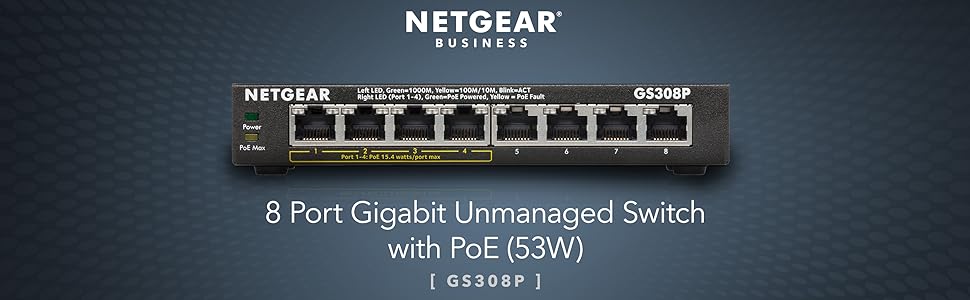The NETGEAR GS308P Unmanaged Power over Ethernet (PoE) Desktop Switch features 8-Port Gigabit Ethernet, 4 PoE ports with a 55 watt budget, sturdy metal fanless housing and more.