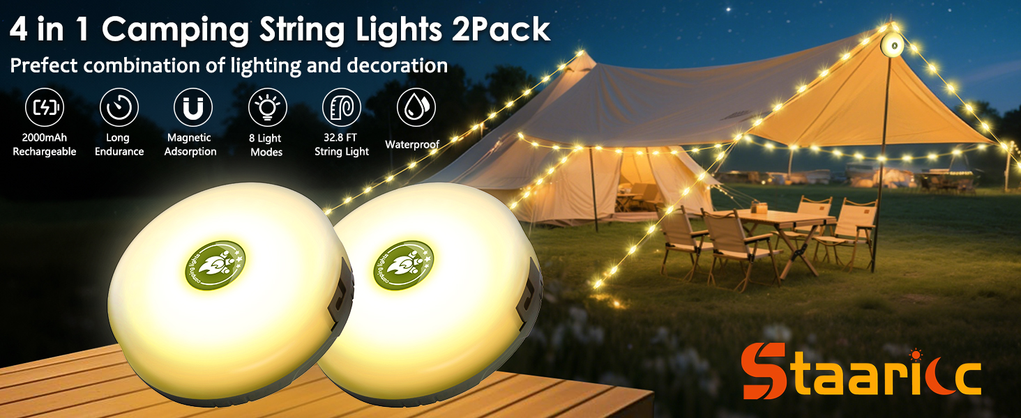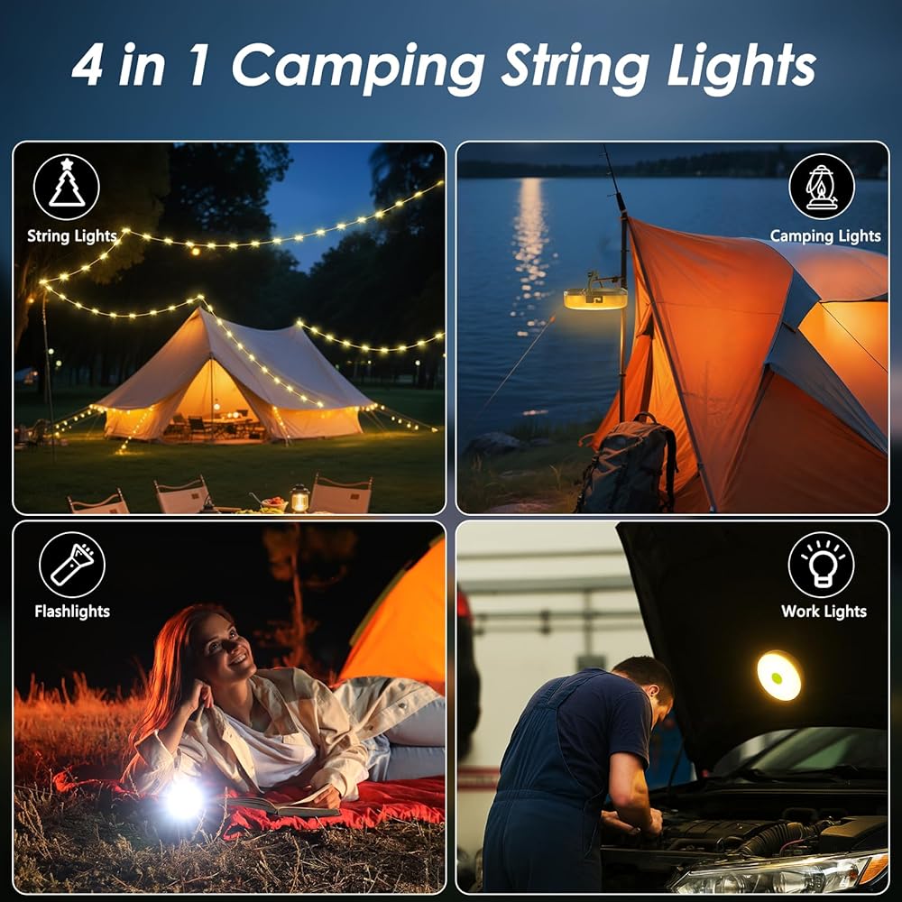 4-in-1 Camping String Lights: One buying choice as four lights function - string lights, camping lights, flashlights, work lights. It can be used as string lights at camping, picnic and parties; as camping lights and flashlights during hiking, travel and camping; as work lights when doing repair work and some emergency situations.