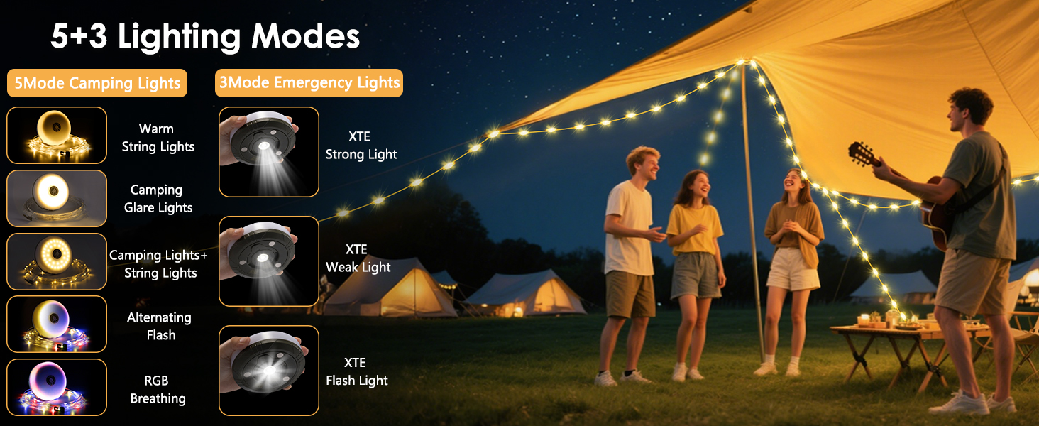 8 Different Lighting Modes: Press the power button to switch 5+3 lighting modes. 5 camping lights modes on the front: warm string lights, RGB alternate flash, RGB breathing, camping light + string light warm, camping glare light; 3 emergency light modes on the back: strong light, weak light and strobe mode, you can long press to turn on the emergency light on the back.