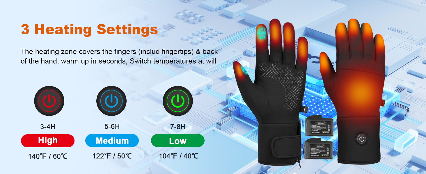 【Safety & 3-Level Heating】Our rechargeable heated gloves has adjustable wrist strap block biting wind. Features UL/FCC-certified batteries with 3 heat settings (Low: 7-8H /Med: 5-6H /High: 3-4H) and overcharge protection for worry-free outdoor adventures.
