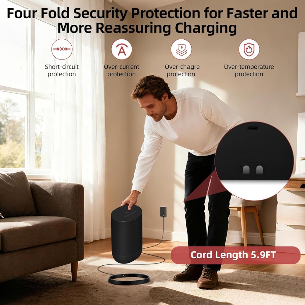 This third-party replacement charging dock is compatible with Sonos Move 1st & 2nd Gen speakers (speaker not included). Featuring an anti-slip weighted base to prevent rollover and a scratch-resistant surface, it's compact at 270g with a 5.9ft cable—easy for home use or travel. Plug-and-play design lets you start charging instantly by placing the speaker on the perfectly fitting base. Crafted from high-quality materials with a built-in smart chip, it protects against overcurrent, overcharging, and short circuits for safe, reliable power. Package includes 1 speaker charging dock.