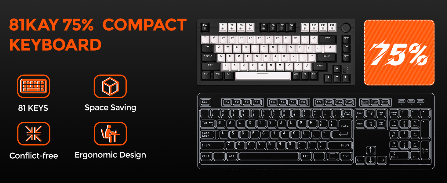 【75% Compact Layout Keyboard】- DAREU EK75 wired gaming keyboard redefines space efficiency with it's 75% compact layout.75% mechanical keyboard can save more desktop space while retaining the necessary arrow keys. all 81 keys are no conflict, allow multiple keys to work simultaneously with high speed for a reliable connection great for typist, programmer, writer etc.