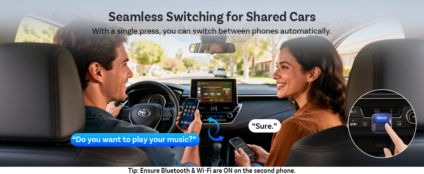 【Auto-Switching That Just Makes Sense】Do you really want to unplug and reconnect every time? Of course not. The Ottocast Mini Core comes with a smart switch button and recognizes your phone automatically. Connected in just 5–8 seconds. Got two phones? No problem — if one's not there, it hops to the next. A wireless CarPlay adapter / Android Auto adapter built for real everyday life.