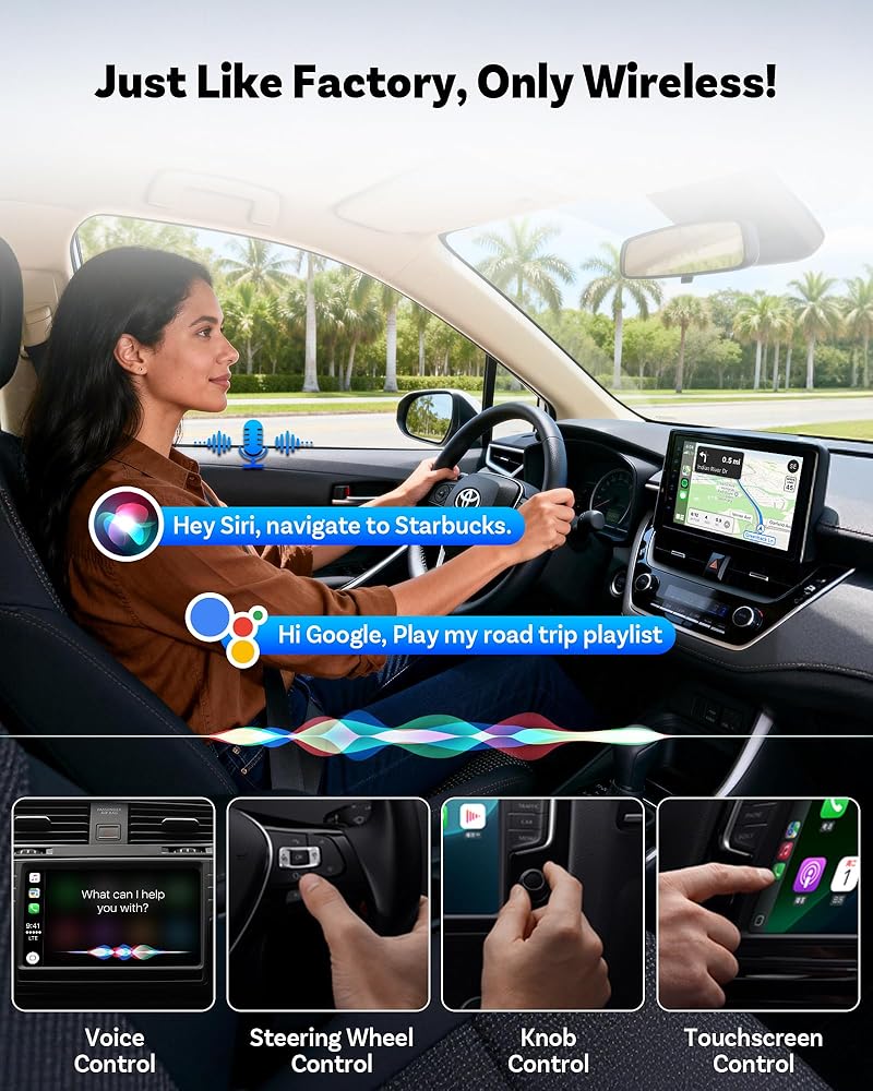 【Start the Car. Stay Connected.】Set it up once and done. Every time you start your car, the 2in1 wireless adapter reconnects automatically — no cables, no hassle. Touchscreen, steering wheel buttons, rotary controls, plus Siri & Google Assistant all work like they should. Built-in temperature control keeps your wireless CarPlay adapter running reliably, even on long drives.