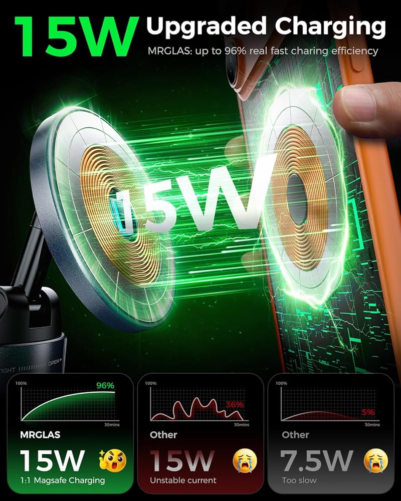 [15W Turbo Wireless Charging]: Get a rush-free commute with MRGLAS's 2026 Magsafe car mount charger. Its reinforced copper coil and smart cooling vents deliver up to 80% charge in just 1 hour for iPhones (lab-tested under optimal conditions). The advanced cooling system ensures a stable 15W Turbo charge while preventing overheating. Note: Requires Qi-certified devices. Charging speeds vary; iPhone results based on controlled testing. Only fast wireless charging for iPhone.
