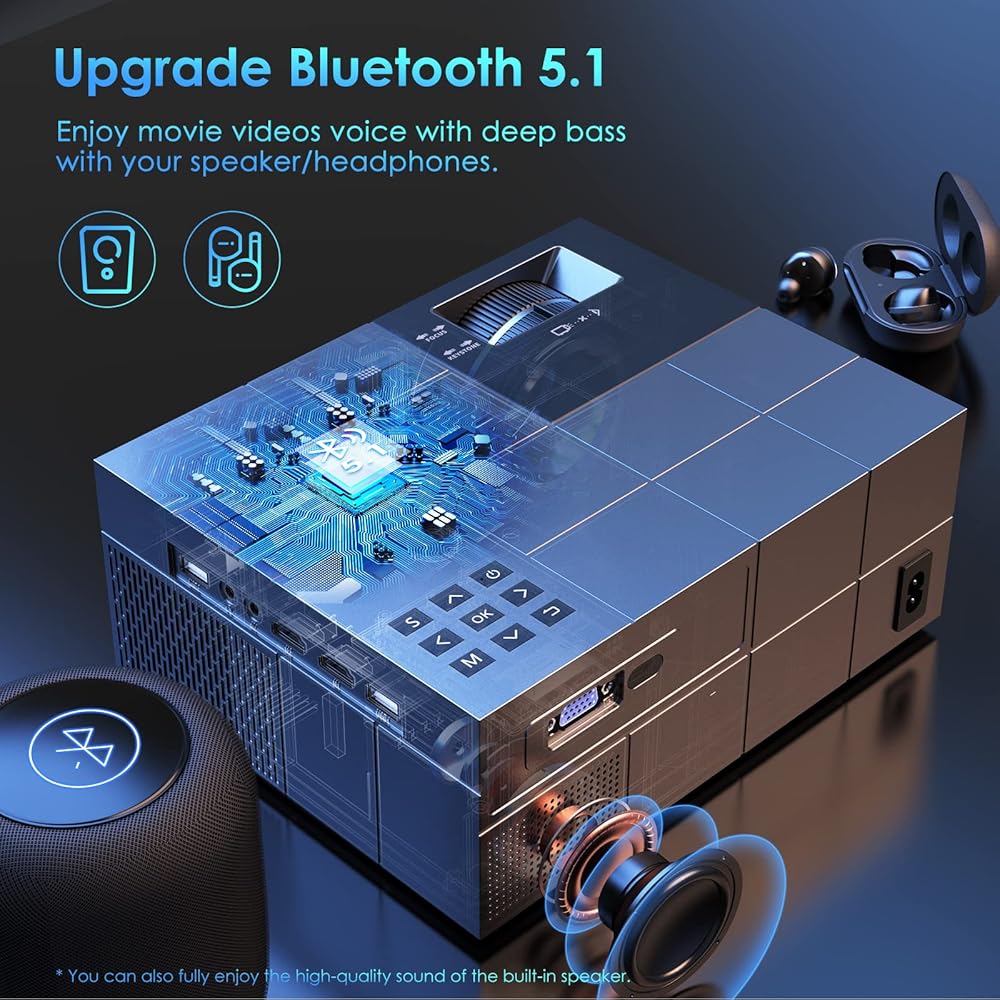 【Bluetooth 5.1 & HiFi Dual Speakers】This Bluetooth projector can connect your speakers or headphones to improve your needs for sound quality, the latest 5.1 Bluetooth chip makes the audio synchronization faster and more stable, and enhances your immersion in the movie scene. The projector's dual built-in HiFi stereo surround speakers restore the original audio fidelity, allowing you to feel an excellent listening experience without connecting external speakers.