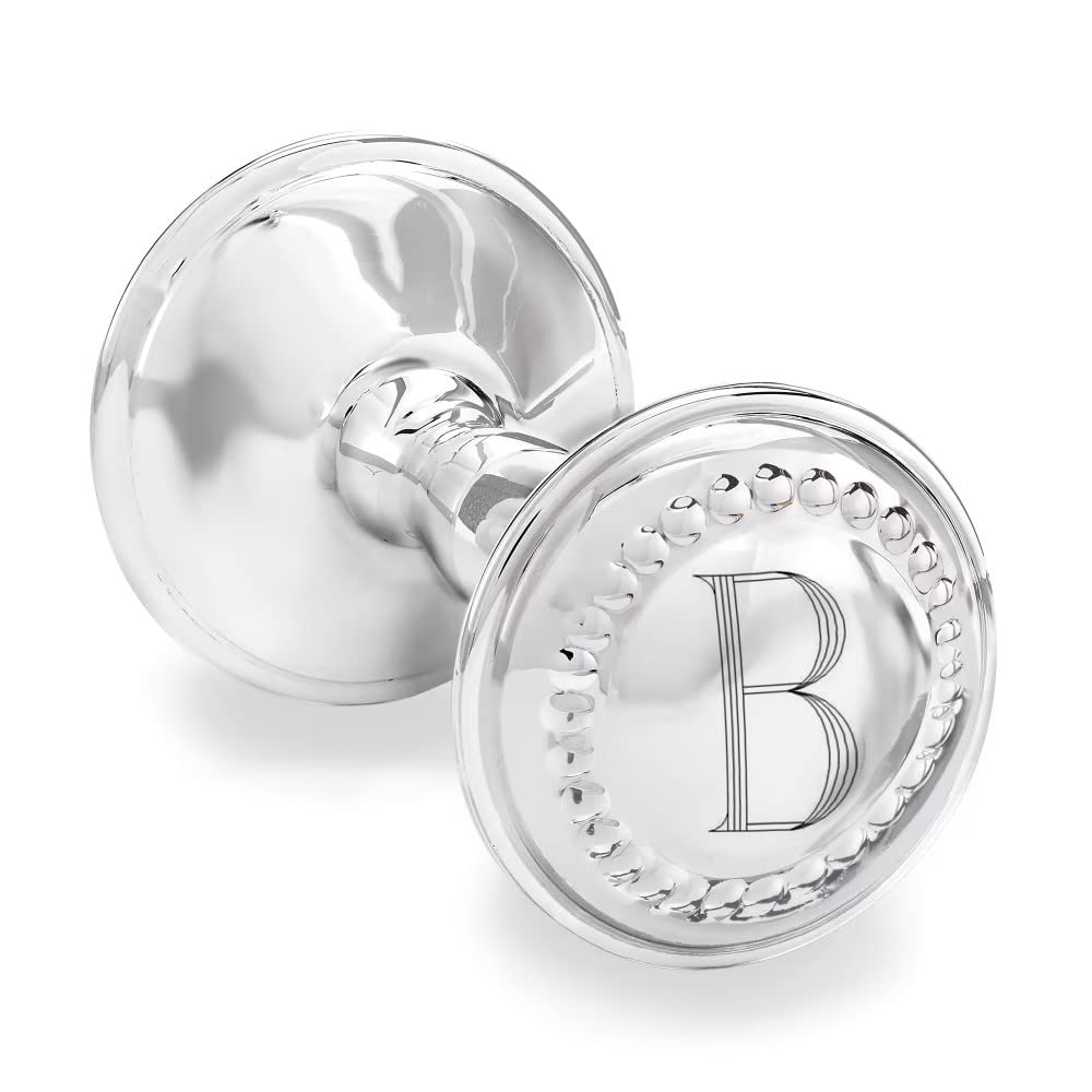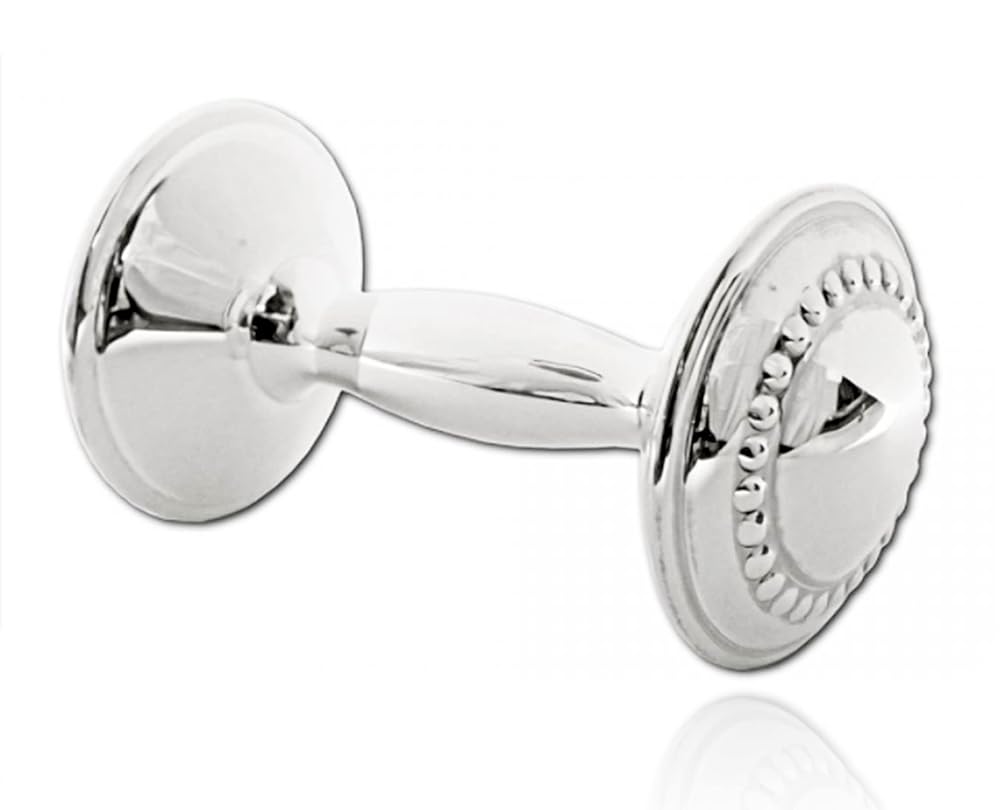 The Cunill Personalized Sterling Silver Bead Barbell Baby Rattle, a timeless and luxurious gift for the new addition to your family. Handcrafted from the finest quality 925 sterling silver, this rattle is designed to be both beautiful and functional. The classic bead barbell design is perfect for both boys and girls, and the gentle rattle sound is soothing and comforting for fussy babies. The rounded edges and smooth finish ensure that it is safe and comfortable for babies to handle and play with. This baby rattle can be personalized with a custom engraving of your choice, making it a truly unique and meaningful gift that will be treasured for years to come. Whether it's a special date, the baby's name, or a heartfelt message, the engraving will make this already special gift even more memorable. This rattle comes in a beautiful gift box, making it easy to wrap and present to the new parents. It's the perfect gift for baby showers, christenings, baptisms, or any special occasion that calls for a truly special and unique gift. Invest in a beautiful and luxurious keepsake that will be cherished for generations with the Cunill Personalized Sterling Silver Bead Barbell Baby Rattle. Order yours today and experience the beauty and quality of this stunning piece for yourself.