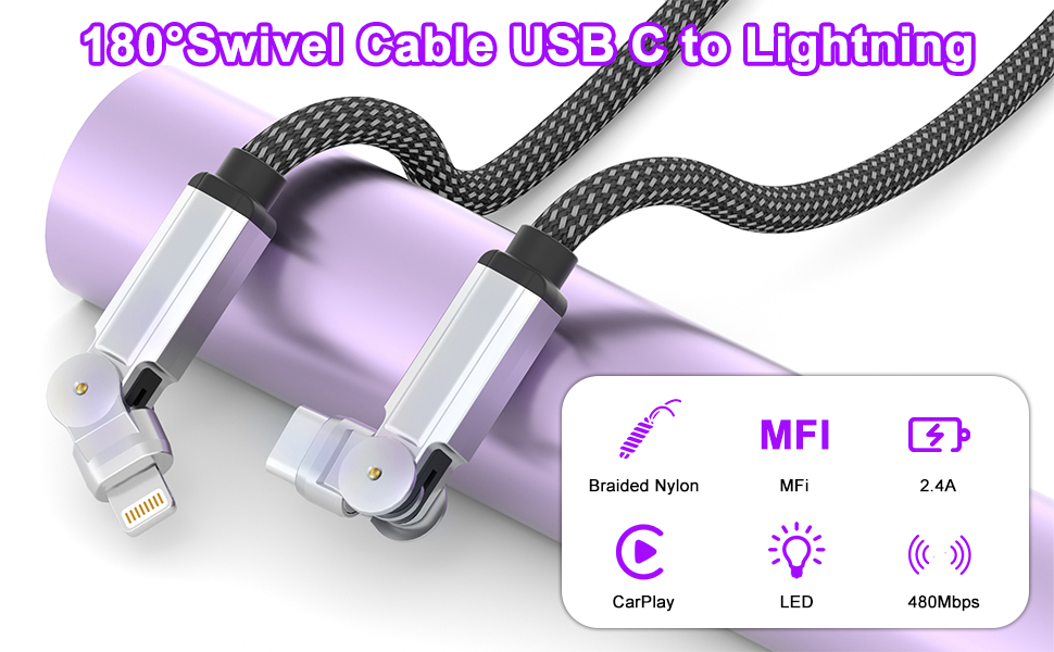 3A Fast Charging, Data Sync & Apple CarPlay: This advanced right angle iPhone Cable delivers 3A fast charging and 480Mbps high-speed data transfer for your iPhone. The swivel lightning cable supports Apple CarPlay functionality, creating a stable connection with your car's entertainment system to enjoy music, podcasts, and navigation while driving safely.