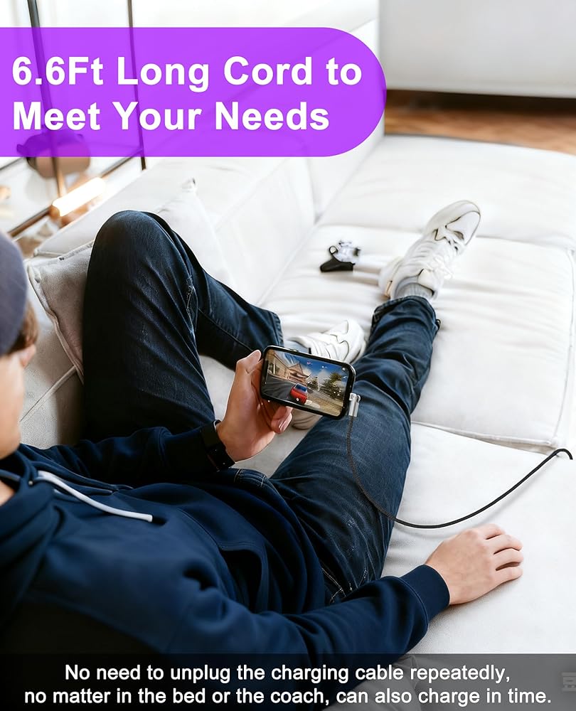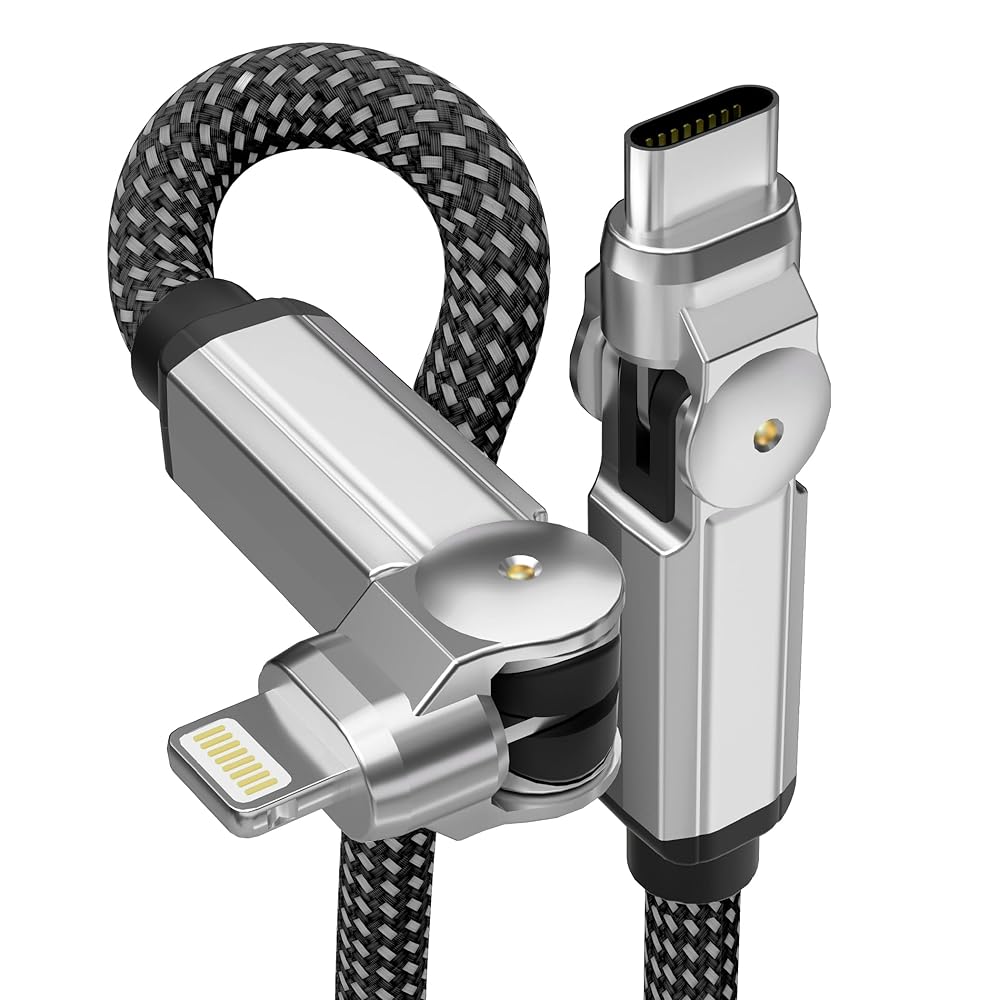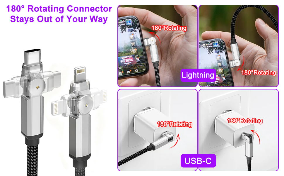 90° Right Angle + 180° Swivel iPhone Charger: Experience the perfect charging angle with our innovative 90 Degree iPhone Charger, featuring a unique 90-degree right-angle plug combined with a 180 degree cable rotating head. This rotating charger design prevents cord bending damage at the connector, significantly extending cable lifespan while providing ultimate convenience for gaming, watching videos, and charging in tight spaces.