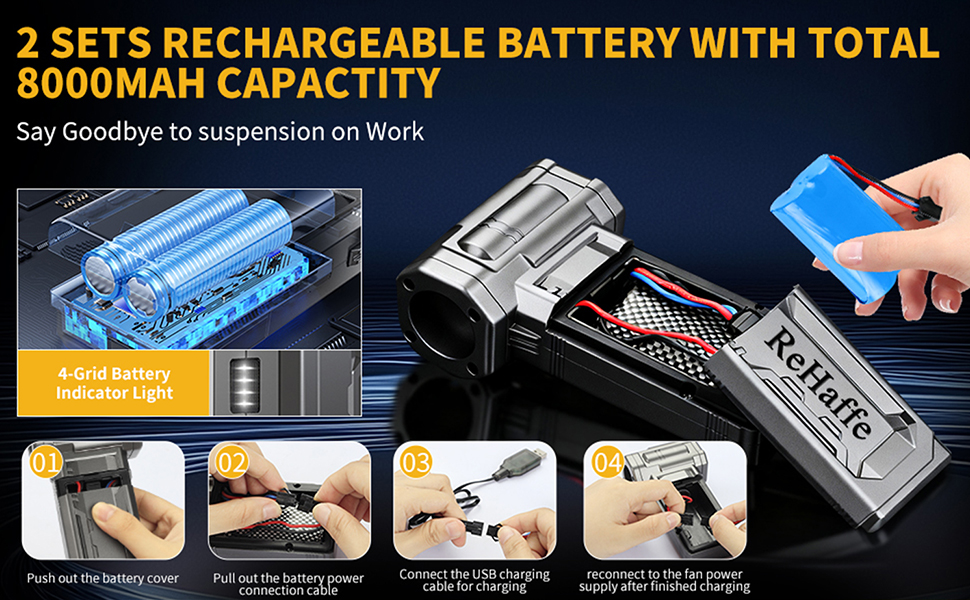 🌟【2 Swappable 8000mAh Batteries for Non-Stop Work】ReHaffe air duster rechargeable with total 8000mAh power provides up to 120 mins of use at 1st gear—seamlessly replace batteries for continuous cleaning. keyboard duster with 4-digit battery indicator shows power in real time; Type-C fast charge (3.5-4hrs) supports 4 charging methods (laptop/power bank/car charger/adapter).
