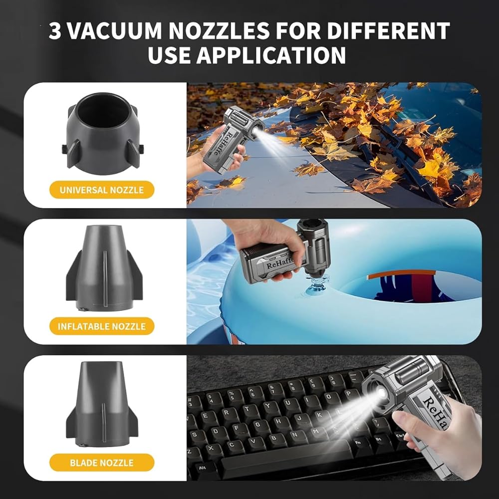 🌟【3 Multi-Nozzle Design for Versatile Use】Cordless air duster comes with 3 detachable nozzles to clean crumbs/hairs/dust from keyboard, computer, car seats, sofas, and air conditioners. This air blower also inflates swim rings, air mattresses, kayaks, and balloons—ideal for home, office, camping, and pet hair drying.