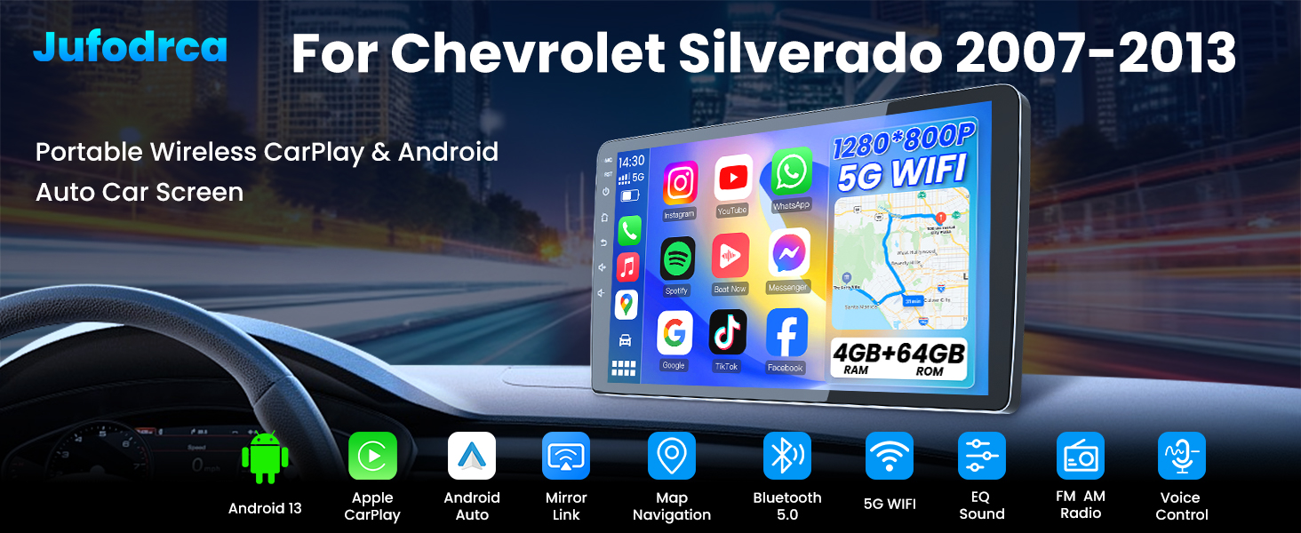 4G+64G Android 13 Car Radio for 2007-2013 Chevy Suburban Tahoe Silverado: GMC Yukon 9" 1280 * 800 IPS Touch Screen Stereo Wireless Carplay Android Auto 5G WiFi Bluetooth GPS Backup Camera FM SWC