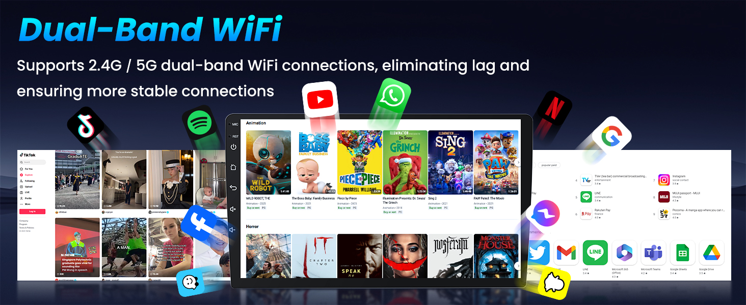 【2.4G/5G WiFi & FM radio】 Dual-band 2.4G/5G WiFi and Bluetooth 5.4 ensure fast pairing, hotspot sharing, and stable streaming. Access YouTube, Spotify, Netflix, TikTok, or download offline GPS maps to guide your journey without internet. Enjoy FM radio with clear reception and 18 preset stations for music, news, or traffic updates.