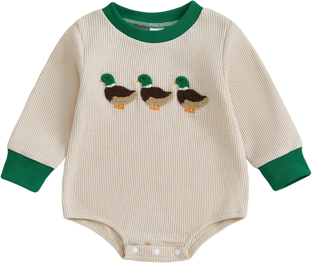 Baby Fall Waffled Romper Stripe Duck Embroidery Long Sleeve Round Neck Jumpsuit