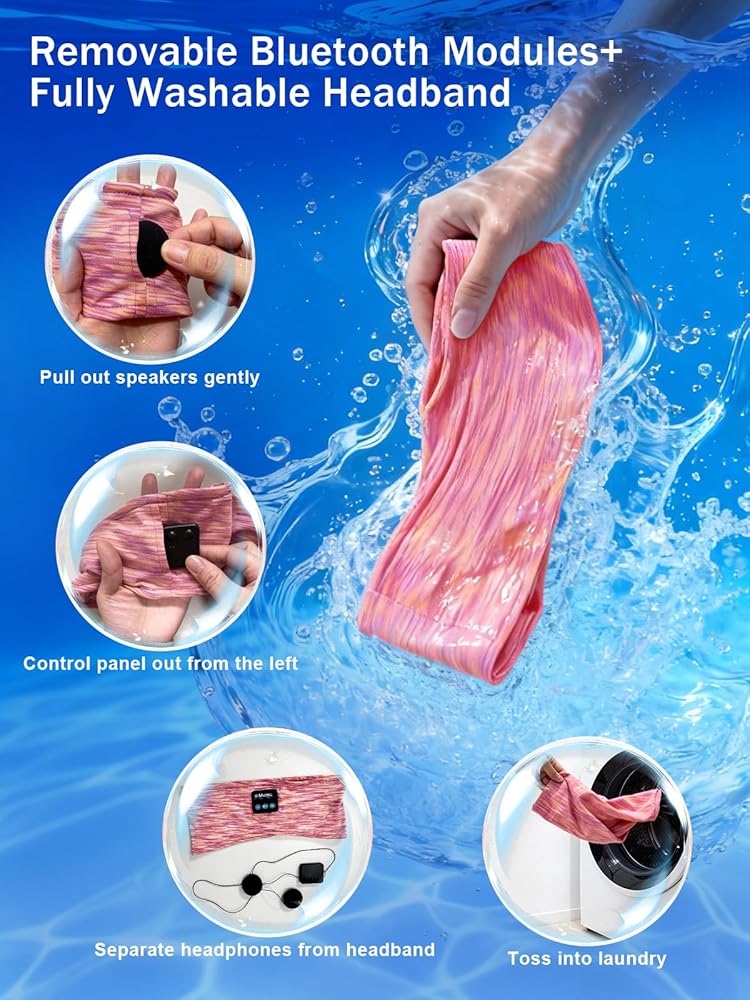 مكونات قابلة للإزالة وقابلة للغسل بالكامل: يمكنك إزالة وحدات البلوتوث بسهولة وإلقاء عصابة الرأس في الغسالة. يبقى منتعشًا للاستخدام الليلي وراحة طويلة الأمد