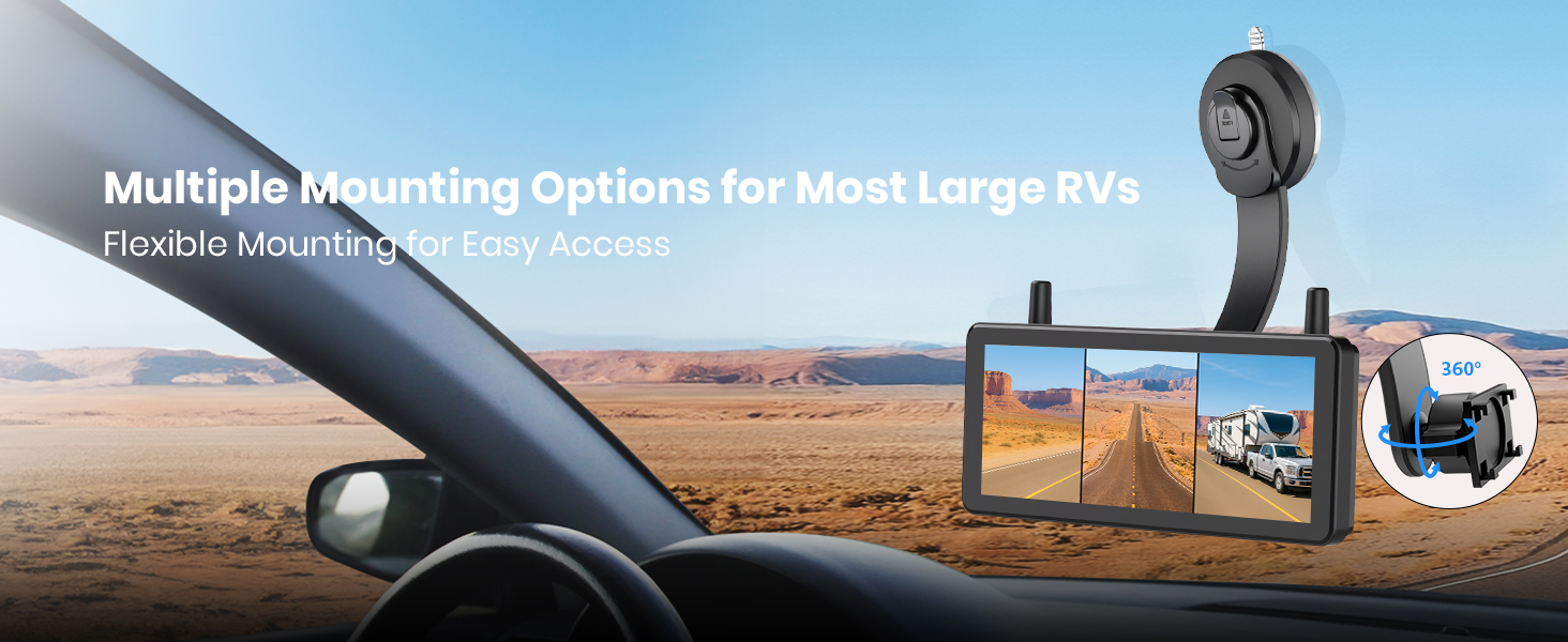 More Flexible Monitoring Choose: The perfect rv backup camera system add a strong suction cup bracket, giving you more freedom to position the 7.2-inch screen on either the windshield or dashboard. The stable mount holds the screen firmly without blocking your forward view, making your RV monitoring setup more versatile