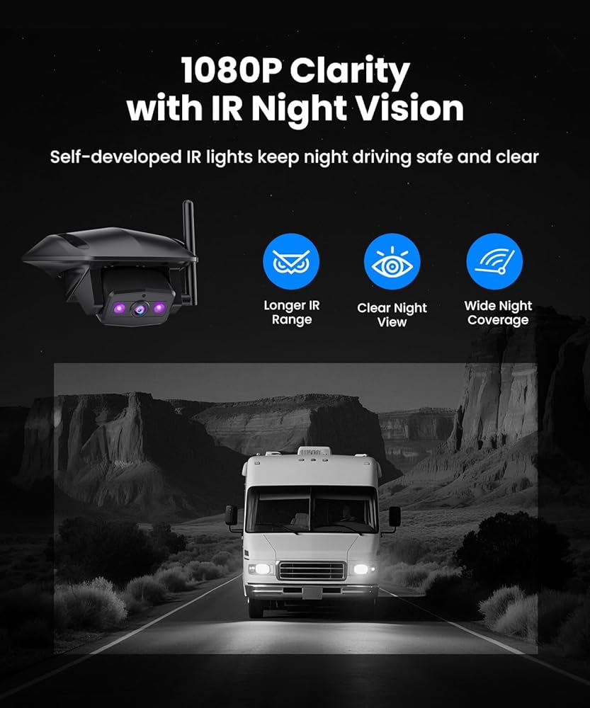 DVR Loop Recording: The system features built-in DVR recording that continuously saves driving and reversing footage. This RV backup camera wireless system automatically overwrites old files, ensuring you always have the latest video evidence for your trips and claims