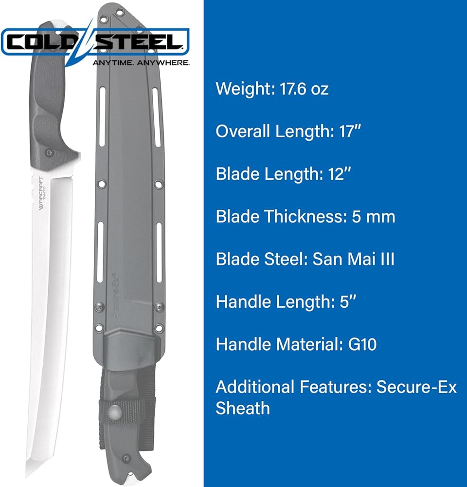 SPECIFICATIONS - Weight: 17.6 oz (498.9 g); Blade Thickness: 5 mm; Blade Length: 12"; Blade Steel: San Mai III; Handle Length/Material: 5" G-10; Overall Length: 17"; Knife Type: Fixed; Blade Shape: Tanto Point; Additional Features: Secure-Ex Sheath