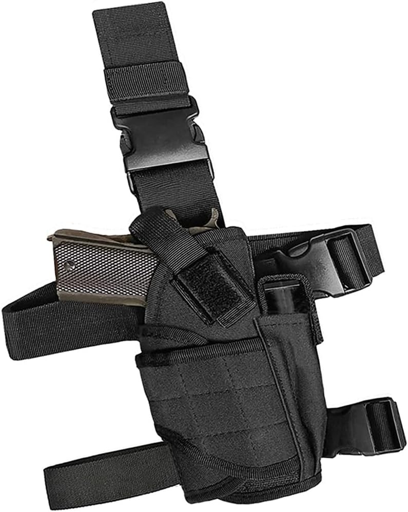 Material: Universal gun holster made of waterproof and sturdy 1000D nylon, Fully adjustable open leg holster to accommodate different sized thigh circumferences.