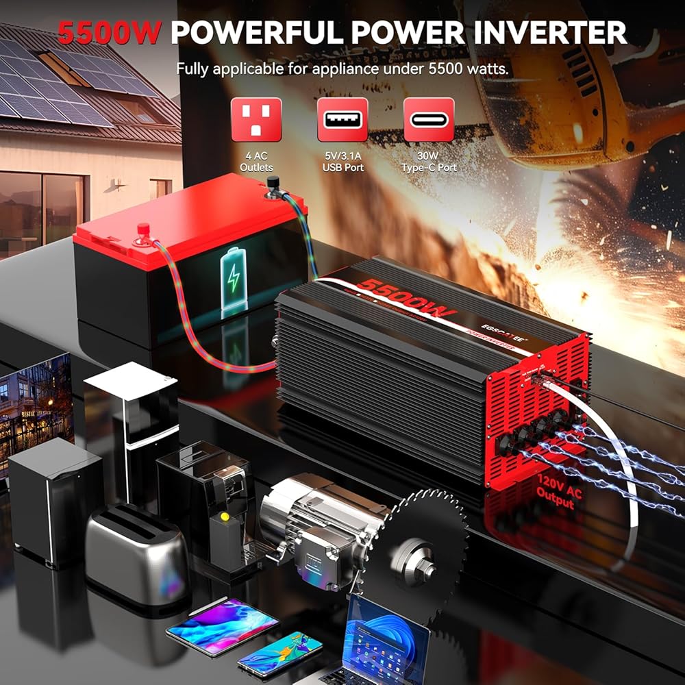 محول طاقة 5500 واط 12 فولت تيار مستمر إلى 120 فولت محول تيار متردد للشاحنة، المنزل، عربة سكن متنقلة، الذروة 11000 واط عاكس طاقة شمسية خارج الشبكة مع 4 منافذ تيار متردد، منفذ USB، منفذ من النوع C، وحدة تحكم عن بعد مع شاشة LCD